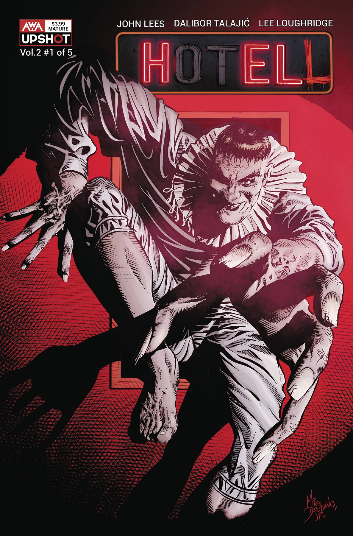 From AWA this week comes Hotell Vol 2 #1. Five more interconnected stories chronicle another harrowing week at Pierrot Courts, the mysterious roadside motel where lost souls make their last stand with the demons that haunt them. A family, desperate and destitute after being evicted from their home. A struggling artist, yearning for inspiration. A lonely bachelor, tending to his beloved, ailing dog. A brutal motorcycle gang, hunting for a runaway initiate...When all these haunted souls check into the Pierrot Courts, who will survive to check out? Cover A by Keron Grant, Cover B by Mike Deodato! $3.99