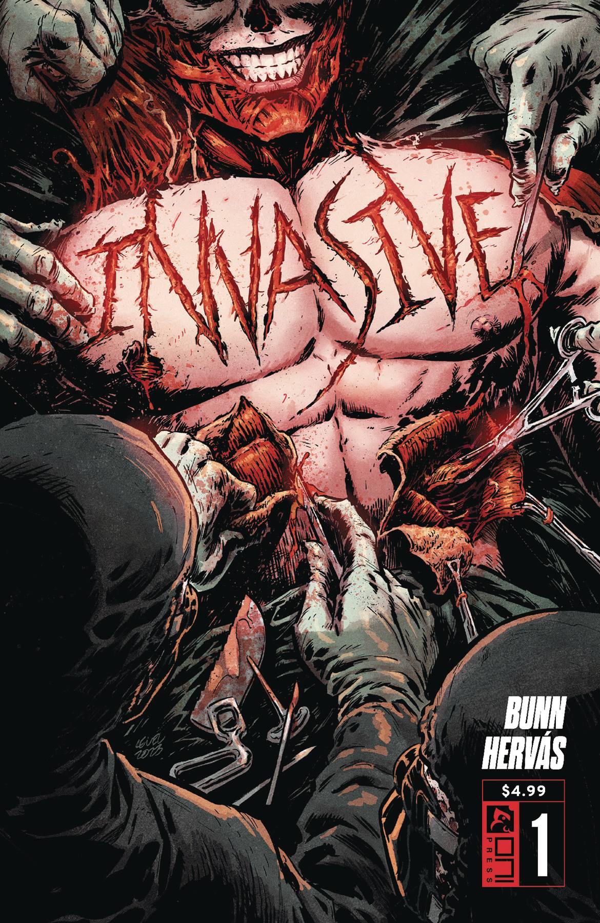 Invasive #1! Beyond excess, beyond ethics, beyond science . . . Enter a terrifying new experiment in pain from Eisner Award nominee Cullen Bunn (The Sixth Gun, Basilisk) and acclaimed illustrator Jesús Hervás (The Empty Man)! Dr. Carrie Reynolds was a veteran trauma surgeon with a godlike mastery of muscle and bone. But outside the operating room, her rigidly ordered life spiraled into chaos when her daughter, Heather-a recovering plastic surgery addict-suddenly disappeared, only to mysteriously reemerge in a catatonic state, her vocal cords removed . . . the latest in a series of victims scarred by a battery of brazenly cruel medical procedures that have baffled police and left an alarming number of once-ordinary citizens maimed, mutilated, or dead on arrival. Deep beneath the streets of Carrie's city, a new kind of underground hospital has just opened its doors . . . and, once inside, there are no rules, no oaths, and no taboos too deep to not to be broken. Together, a new class of surgeon has sworn to pierce the final threshold of accepted medical orthodoxy one incision at a time. The scalpel is their tool. The alleys are their operating theater. Murder is their medicine. And only Carrie can stop what they're planning next . . .