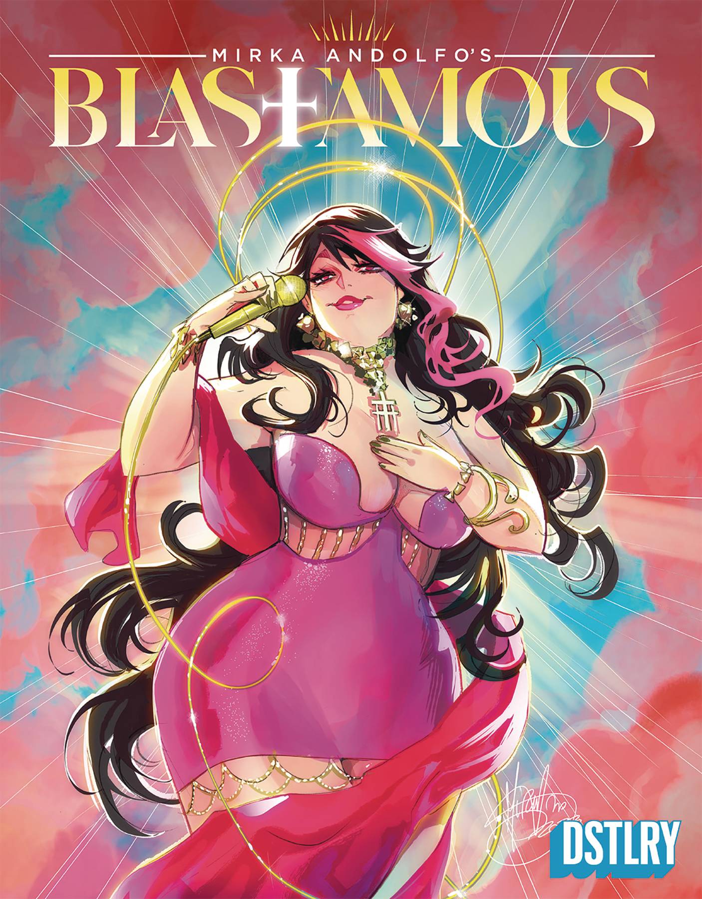 Blasfamous #1! From international superstar MIRKA ANDOLFO (SWEET PAPRIKA, MERCY, UNNATURAL, Harley Quinn, Punchline) comes a new horror comedy that only Andolfo can deliver-asking the question: how many fans is your soul worth? In a world where pop stars have ascended to divinity, and the masses bow in veneration to a new generation of viral superstars-angels and demons thrive on this exaltation, and revel in this spotlight that grants them unimaginable power. Clelia, the reigning queen of pop, finds her throne shaken by a newcomer radiating with enigmatic charm. As her fans waver and the public eye threatens to wander, Clelia and her demonic agent, Father Lev, are thrust into a battle for dominance on this exhilarating stage of music and mysticism. How far will they go to defend her reign and unravel the mystery of this sensational new threat? Mixing the sacred and profane, Harvey Award-winning Mirka Andolfo effortlessly merges the mythological urban fantasy of American Gods with the sardonic wit of The Good Place in a brand new dark series featuring stunning visual and narrative intensity set in the glittering world of pop music. MAGAZINE SIZED!