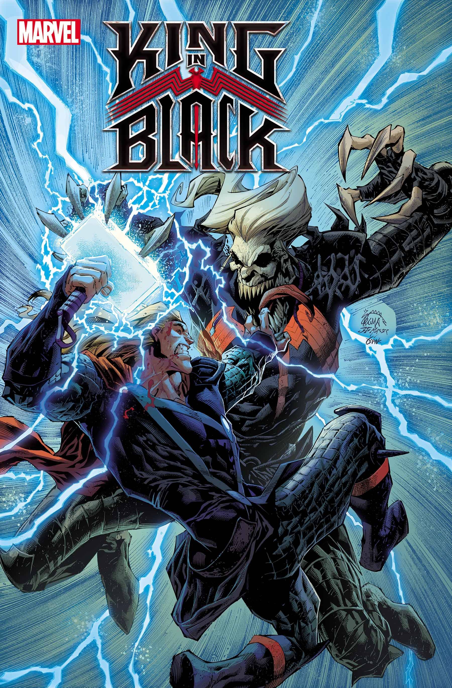Next from Marvel comes King in Black #3! After last issue's shocking finale, the heroes of the Marvel Universe are reeling. Outgunned and outmanned, but never outdone, they unite and face KNULL, God of the Abyss, as he ensnares the planet in the darkness of his reign! Superstars DONNY CATES and RYAN STEGMAN continue to raise the game - and the stakes for the Marvel Universe in this Earth-shattering epic! Main cover by Ryan Stegman, Tattoo variant by Ian Bederman, Alien variant by Valerio Giangiordano, Lashley spoiler variant, Yu connecting variant.