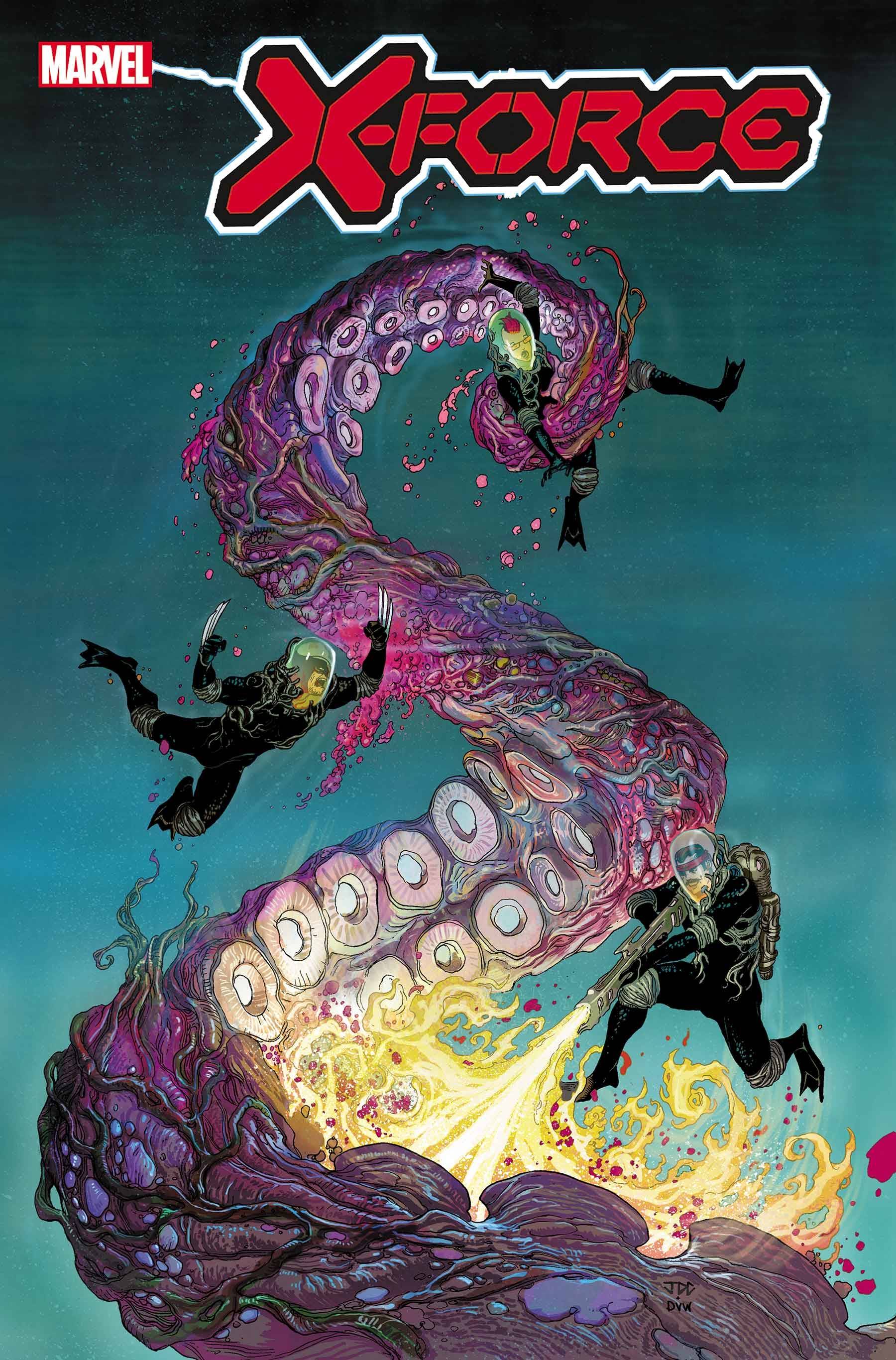 Finally from Marvel comes X-Force #16! TERRORS OF THE DEEP!FORGE, WOLVERINE and QUENTIN QUIRE brave the depths of the sea, where a deadly discovery reveals a dark side of KRAKOA. Main cover by Joshua Cassara, Alien variant by Salvador Larocca.
