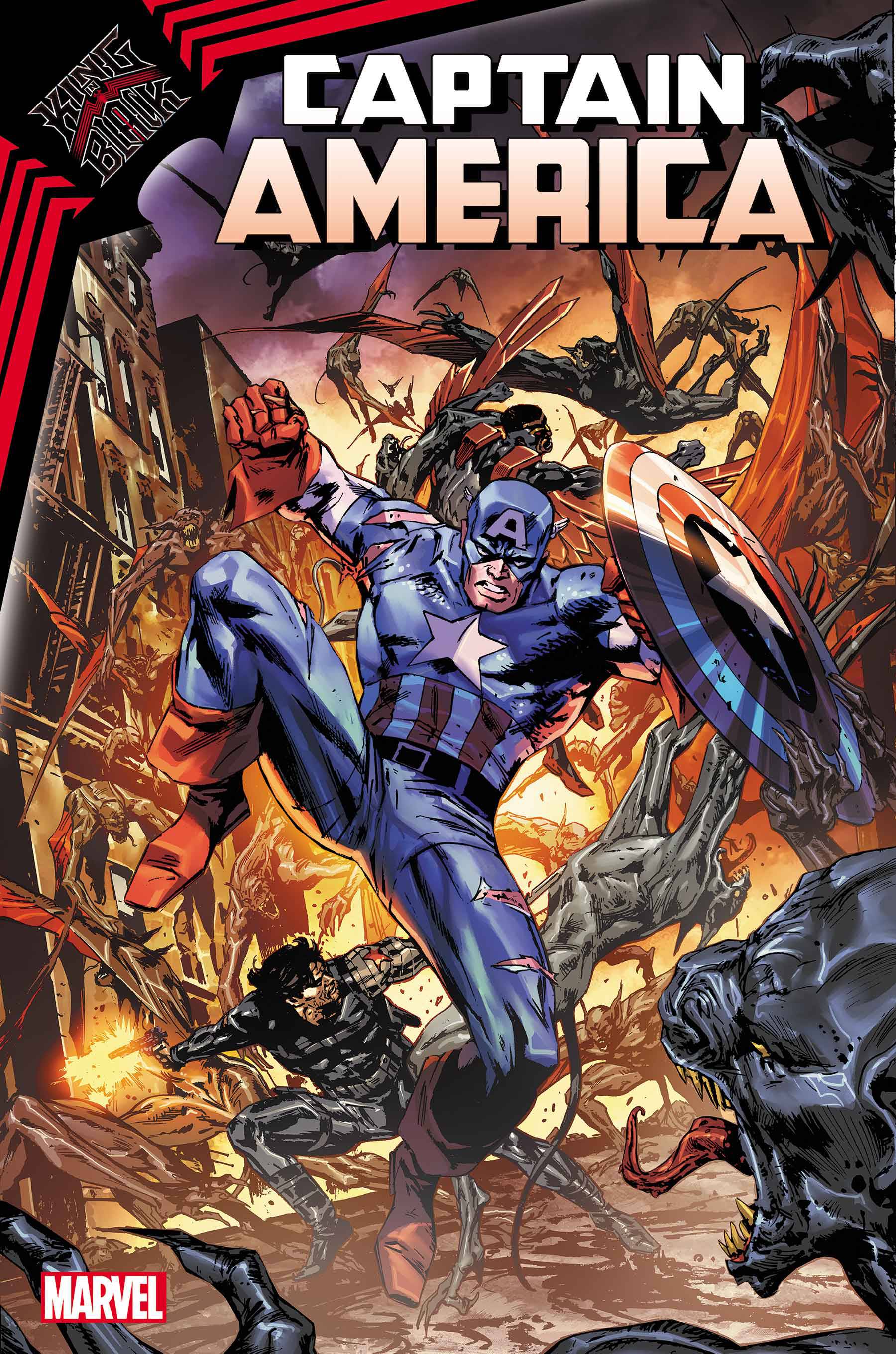Next from Marvel this week comes King In Black Captain America #1 (one-shot). Captain America is in a brutal battle to win the streets of Manhattan back from Knull's forces, aided by the Winter Soldier and the Falcon...but there's a darkness inside Steve that he's struggling to shake. Can his closest friends help him through, or will he succumb to the shadows? Danny Lore (IRONHEART 2020) and Mirko Colak (DEADPOOL, PUNISHER) join forces for a twisted and terrifying story at the heart of the war against Knull! Main cover by Slavador Larocca, Avengers Mech Strike variant, Black History Month variant, Butch Guice variant. $4.99