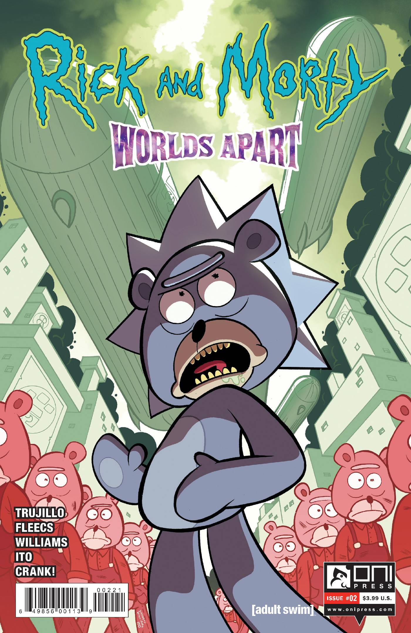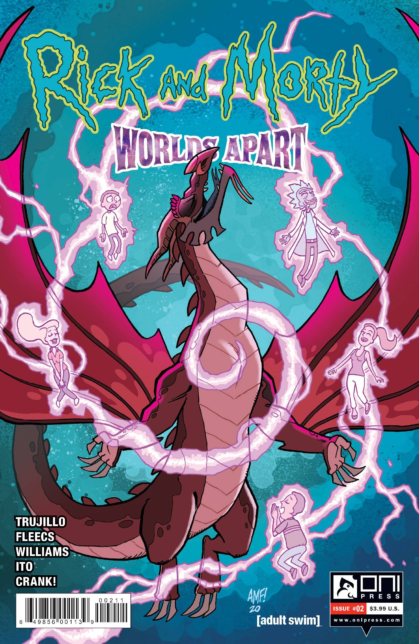 Rick & Morty Worlds Apart #2. It's a world-building-bake off...at UNIVERSAL SCALE! Rick and Facsist Teddy Rick (please don't try this at home) engage one another in a gentleman's wager, while Morty and Grandpa Leonard engage in...activities with the S**t Dragons. It's wild. Cover A by Tony Fleeces, Cover B by Jarrett Williams.