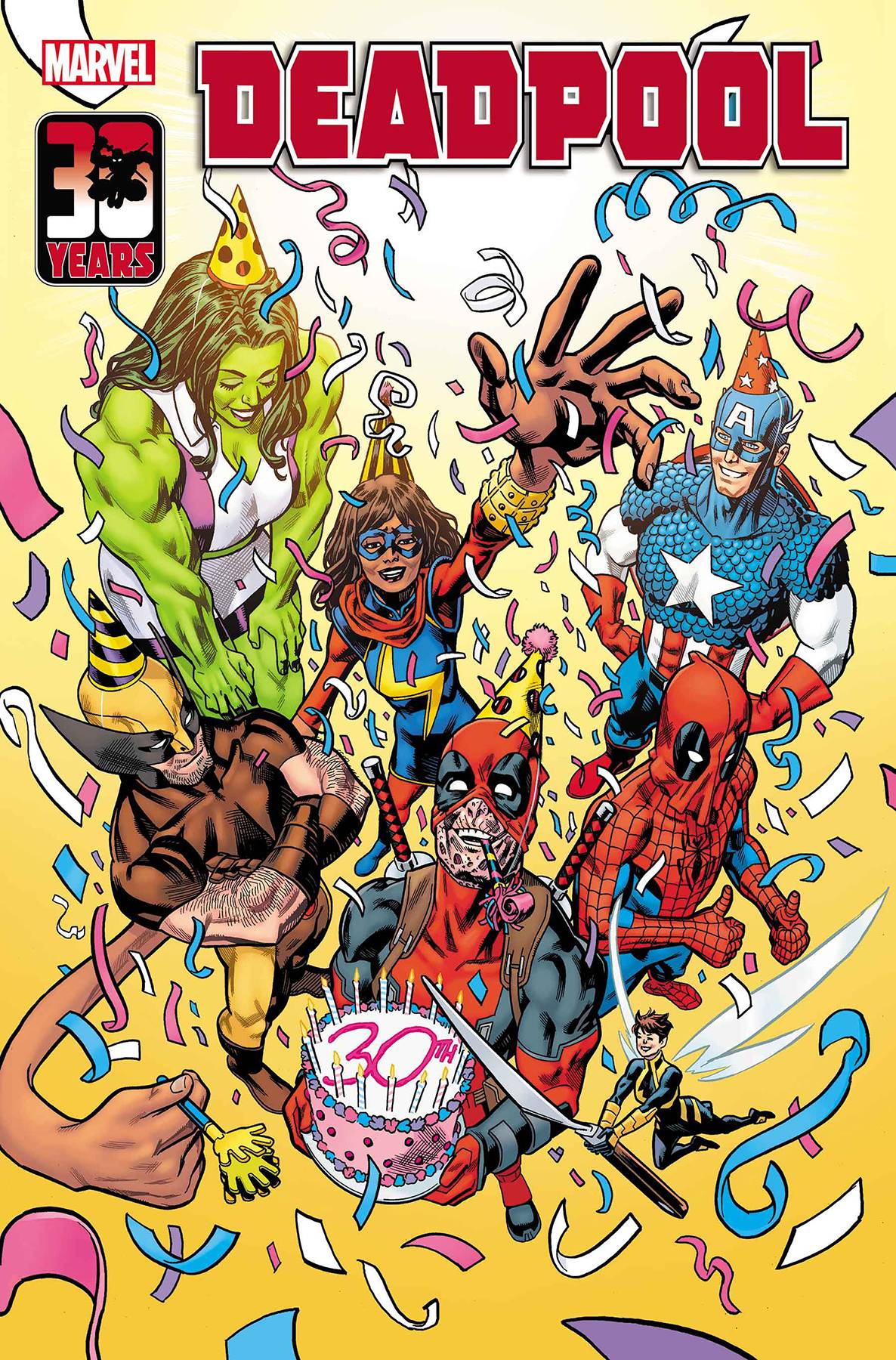 Next from Marvel comes Deadpool Nerdy 30 #1 (one-shot). HE'S THE MERC WITH THE MOUTH! (FULL OF BIRTHDAY CAKE!) Deadpool's turning 30! And to help celebrate, we've assembled some of his classic storytellers to tell tales of Wade Wilson birthdays past, present and future! A first birthday with time-traveling assassins! A sweet sixteen party that would make Molly Ringwald weep! A 100th birthday that could only be celebrated in grand Deadpool style! Blow out the candles! Pin the cybernetic arm on the Cable! And open this present, just for you! Cover A by Ed McGuinness, variant by Mike Hawthorne, variant by Rob Liefeld. $5.99