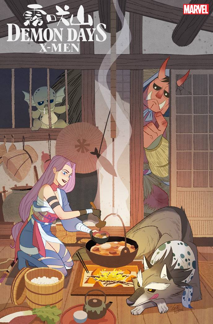 Next from Marvel comes Demon Days X-Men #1 (of 5). From STORMBREAKER PEACH MOMOKO comes a Marvel story unlike any you've ever seen before! A wandering swordswoman with a psychic blade arrives at village that's being targeted by demons. One demon is black and white with a terrifying red tongue and another may be the strongest demon there is! In the stunning kick-off issue of this prestige quarterly story, you'll see a revolutionary reimagination of the Marvel Universe that could only come from Peach Momoko. Ready your katana and enter a mysterious world of demons, monsters, mutants, and magic! Book ONE of FIVE of the DEMON DAYS saga! Main cover by Peach Momoko, ArtGerm variant, Mark Brooks variant, Gurihiru variant, Leinil Yu variant.