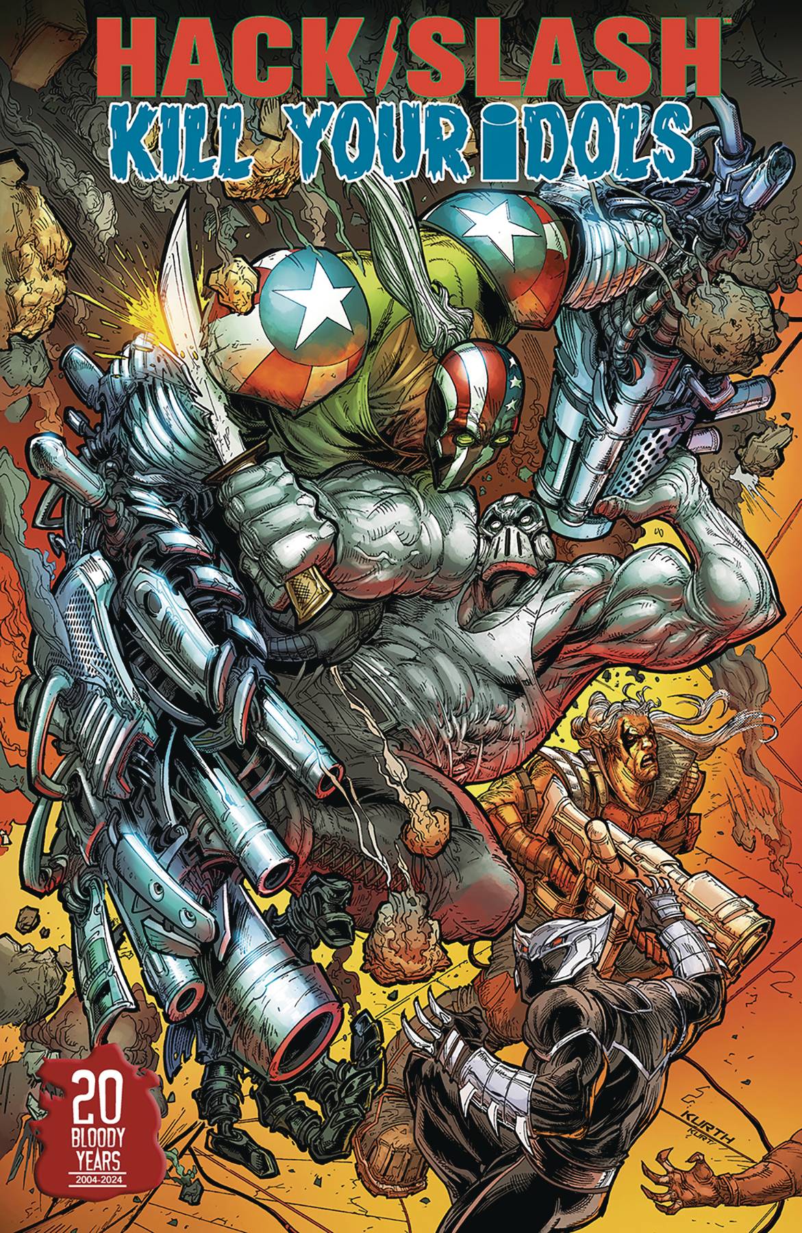 Hack Slash Kill Your Idols (One-Shot)! Slasher hunters Cassie Hack and Vlad are back with a one-shot collecting the all-new "KILL YOUR IDOLS" serial from the IMAGE! 30TH ANNIVERSARY ANTHOLOGY series! When Cassie and Vlad encounter an unusual slasher, they're led to the front door of cyborg former super soldier Superpatriot! Now, the horror hunters are drawn into a race against time alongside a lost super-team in a tour of the gritty underbelly of the Image Universe! Featuring art from the original HACK/SLASH creative team, STEFANO CASELLI & TIM SEELEY, just in time to celebrate the 20th anniversary of HACK/SLASH in 2024!