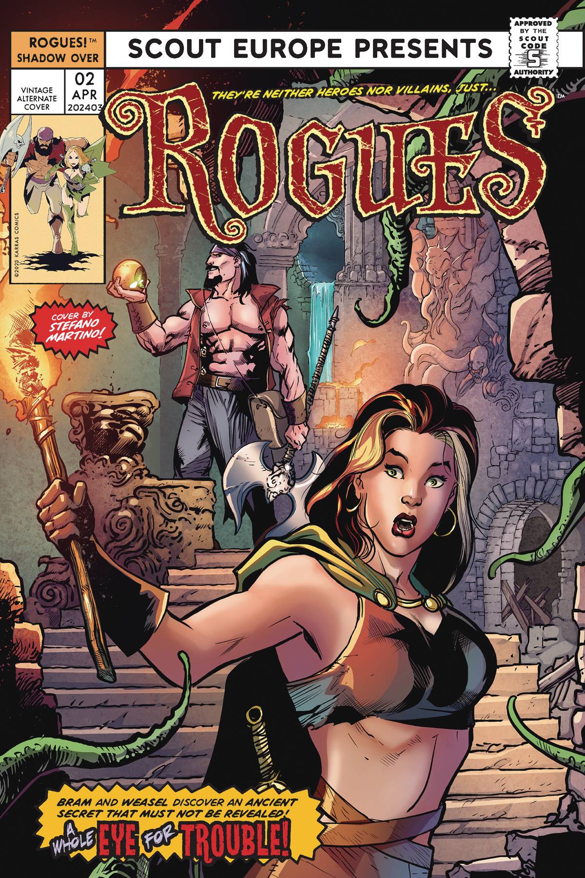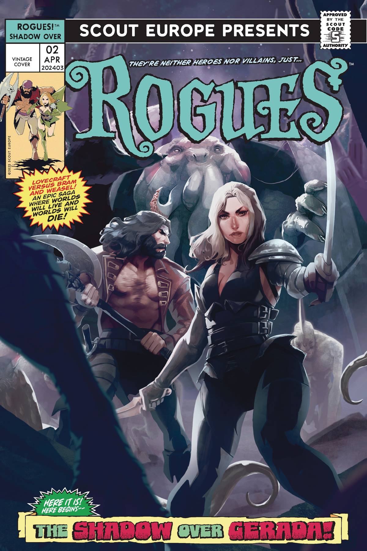 Rogues #2! Are you ready to witness the Rogues battling against Lovecraftian creatures? Bram and Weasel are back in the mythical city of Gerada with a strange artifact-The Eye of Byatis! And they really want to sell that Eye before it rots! What our héroes don't suspect is that they are about to bring doom down on the city-the arrival of a cosmic horror sent by the Elder Ones!