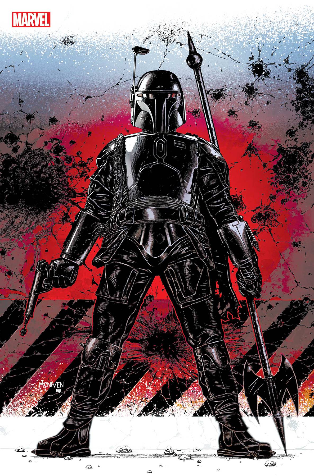 Next From Marvel comes Star Wars: War of the Bounty Hunters Alpha #1 (one-shot). THE STAR WARS COMIC EVENT YOU'VE BEEN WAITING FOR! The notorious bounty hunter BOBA FETT has finally landed his greatest prize - HAN SOLO, frozen in carbonite for easy transport. Fett will bring the smuggler to TATOOINE to collect the massive bounty placed on Solo's head by the fearsome crime lord JABBA THE HUTT. Sounds easy. What could go wrong? Main cover by Steve McNiven, Action Figure Variant by JTC, Crimson Variant by Steve McNiven, Leinil Yu Variant. $3.99