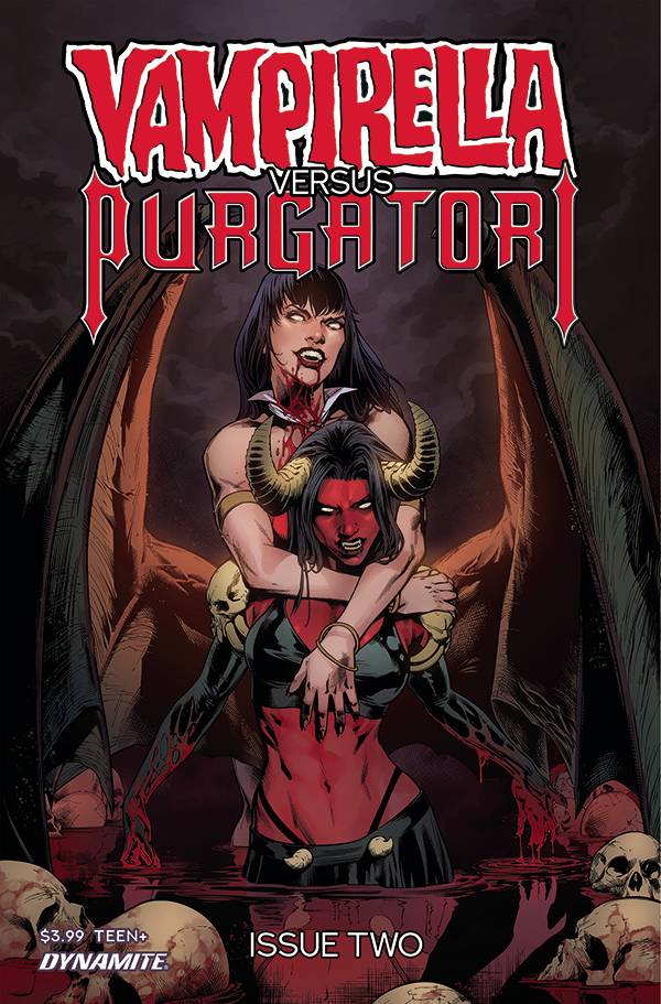 Vampirella Vs Purgatori #2. So yeah. Vampirella and Purgatori. Vampi, the Vampiri with a conscience and Tori, the lady-shaped creature who eats conscience. Working together? Not really. Working towards a common goal, while considering tearing each other's throats out, more like! And that common goal is to stop Lilith and her near-infinite minions from having their rough, rude way with the entire human race. The stakes are big enough... and sharp enough. Everybody's in... it's time to ante up. Cover A by Derrick Chew, Cover B by Carlo Pagulayan, Cover C by Russell Fox, Cover D by Szymon Kudranski, Cover E by Madibek Musabekov.