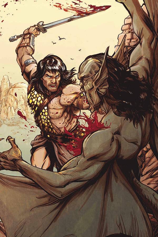 Cimmerian: Iron Shadows in the Moon #2! Conan and Olivia escape to a remote island, attempting to flee their oppressors. But as they take refuge inside an ancient temple, avoiding the dangers that lurk in the nearby jungle, they may have awakened an ancient evil that humankind has yet to comprehend. Will they find a way to escape before they are overcome by threats inside and out? Cover A by Leirix Li, Cover B by JBStyle, Cover C by Mateo Guerrero, Cover D by Fritz Casas!