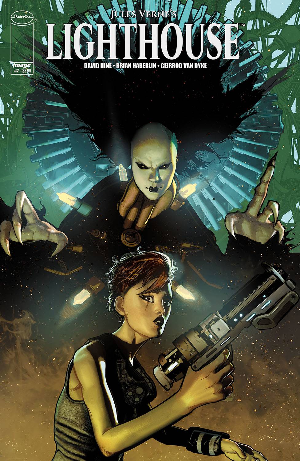 Jules Verne’s Lighthouse #2 (of 5). When Vasquez runs out of her medication, her nanny bot Moses comes up with a new prescription. Now she has to contend with mood swings and side effects as well as a horde of murderous space pirates. This could turn out to be a very bad day. Cover A, B, and C all by Brian Haberlin & Geirrod Van Dyke!