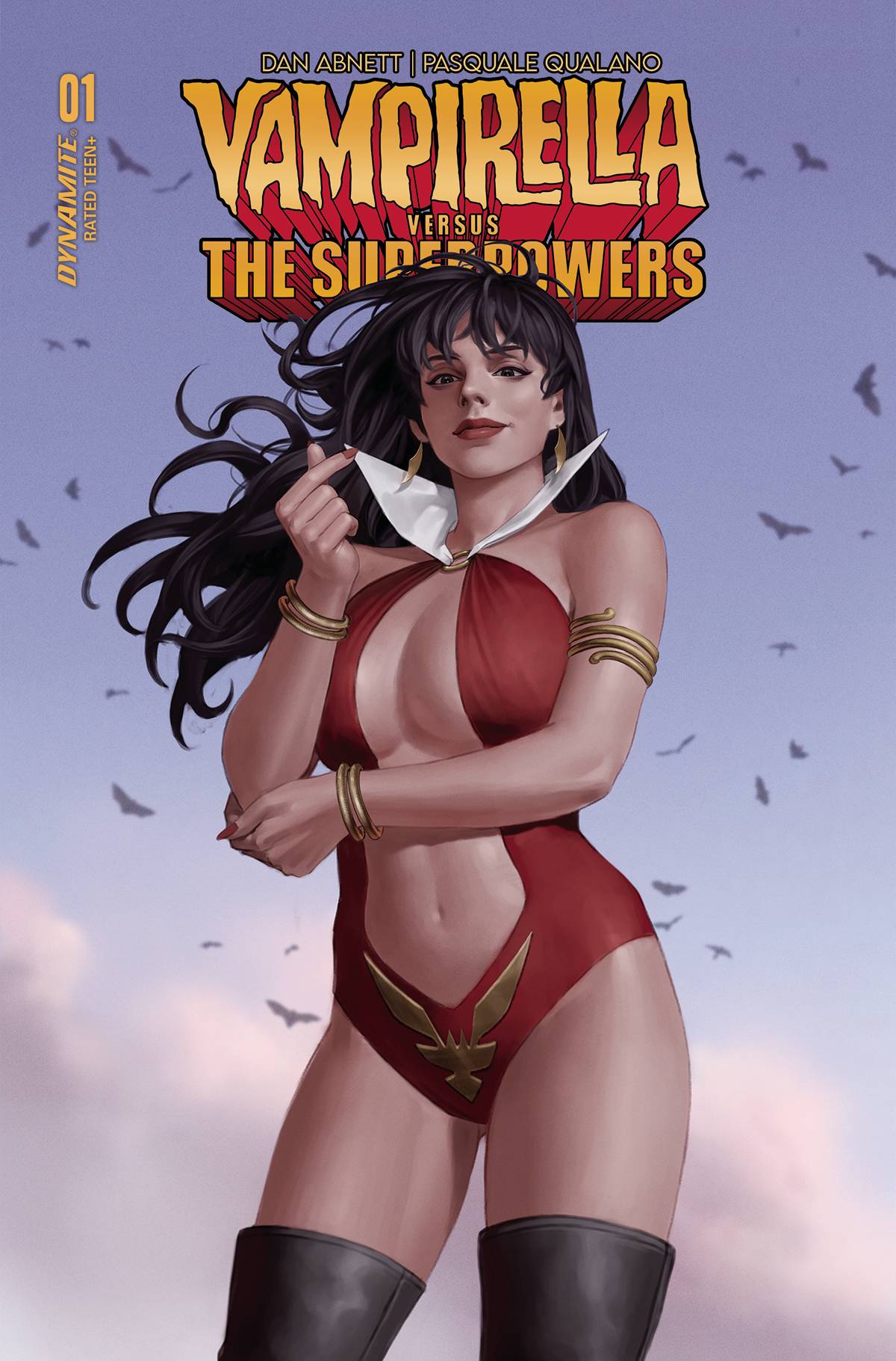 Vampirella Vs the Superpowers #1! It's full-throttle throwback action, courtesy of superstar writer Dan Abnett (Avengers, Warhammer) and red-hot artist Pasquale Qualano (DC Vs. Vampires)! Vampirella and her trusty sidekick Dyna Might have become superheroes, and are assigned to save a world that looks strangely similar to 1940s Earth, rife with crime and corruption, and two-fisted superheroes who don't take kindly to meddling from interdimensional vampire aliens! Can Vampirella survive an onslaught of conflict from villains and heroes alike, all while solving a murder mystery and keeping her precocious sidekick alive?