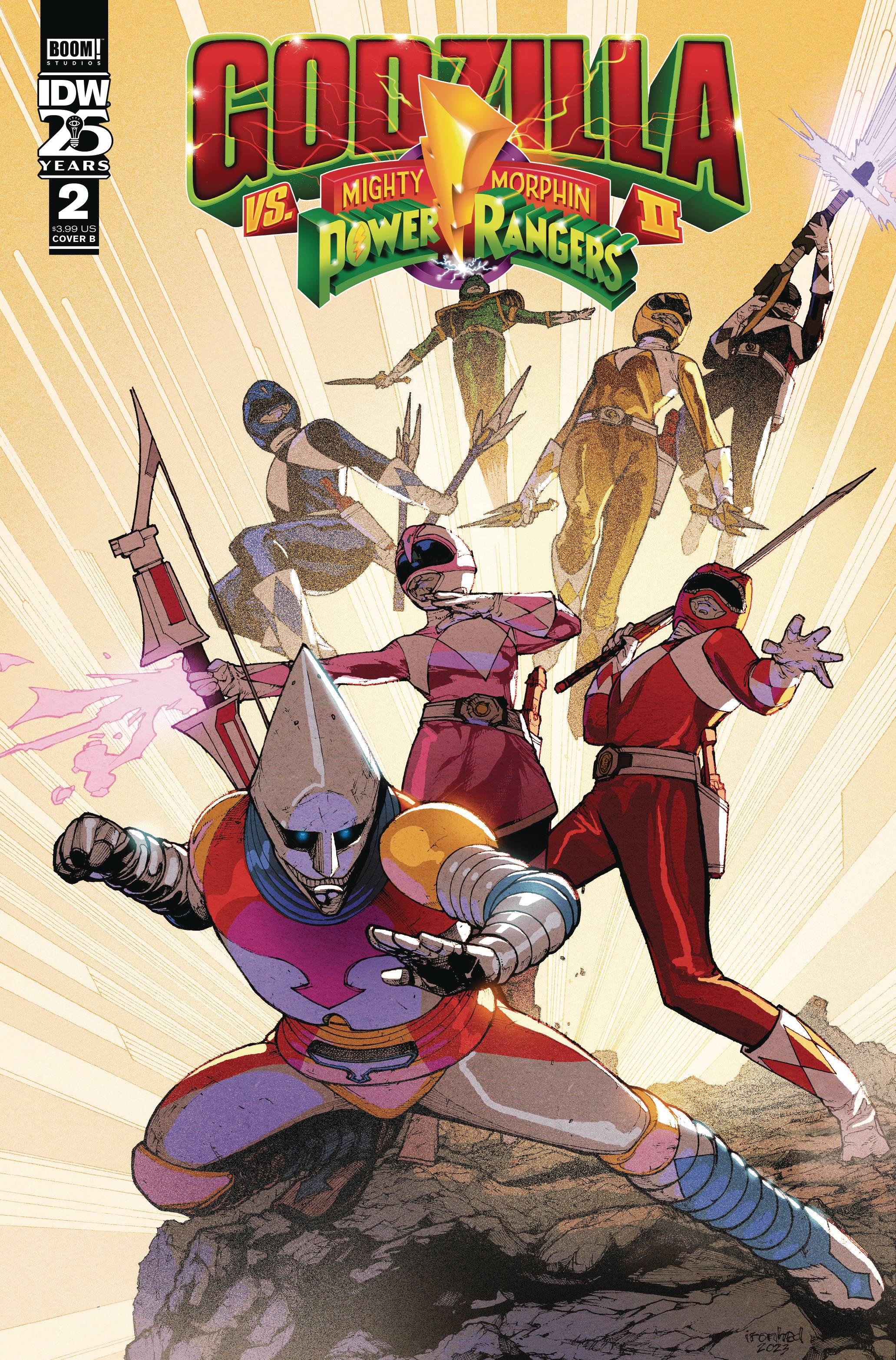 Godzilla Vs MMPR 2 #2! The Mighty Morphin Power Rangers and Godzilla have been caught in a sprawling space-time scheme orchestrated by Rita Repulsa and Astronema! They team up to save alternate versions of the Power Rangers from being targeted by sinister forces. As the Power Rangers and Godzilla transverse realities with the help of a newfound ally, the shape of the foes they face become clear: the Psycho Rangers! But the Psycho Rangers have siphoned powers and abilities from beyond their own world, and if the Rangers and Godzilla can't stop them, the entire multiverse will suffer the consequences!
