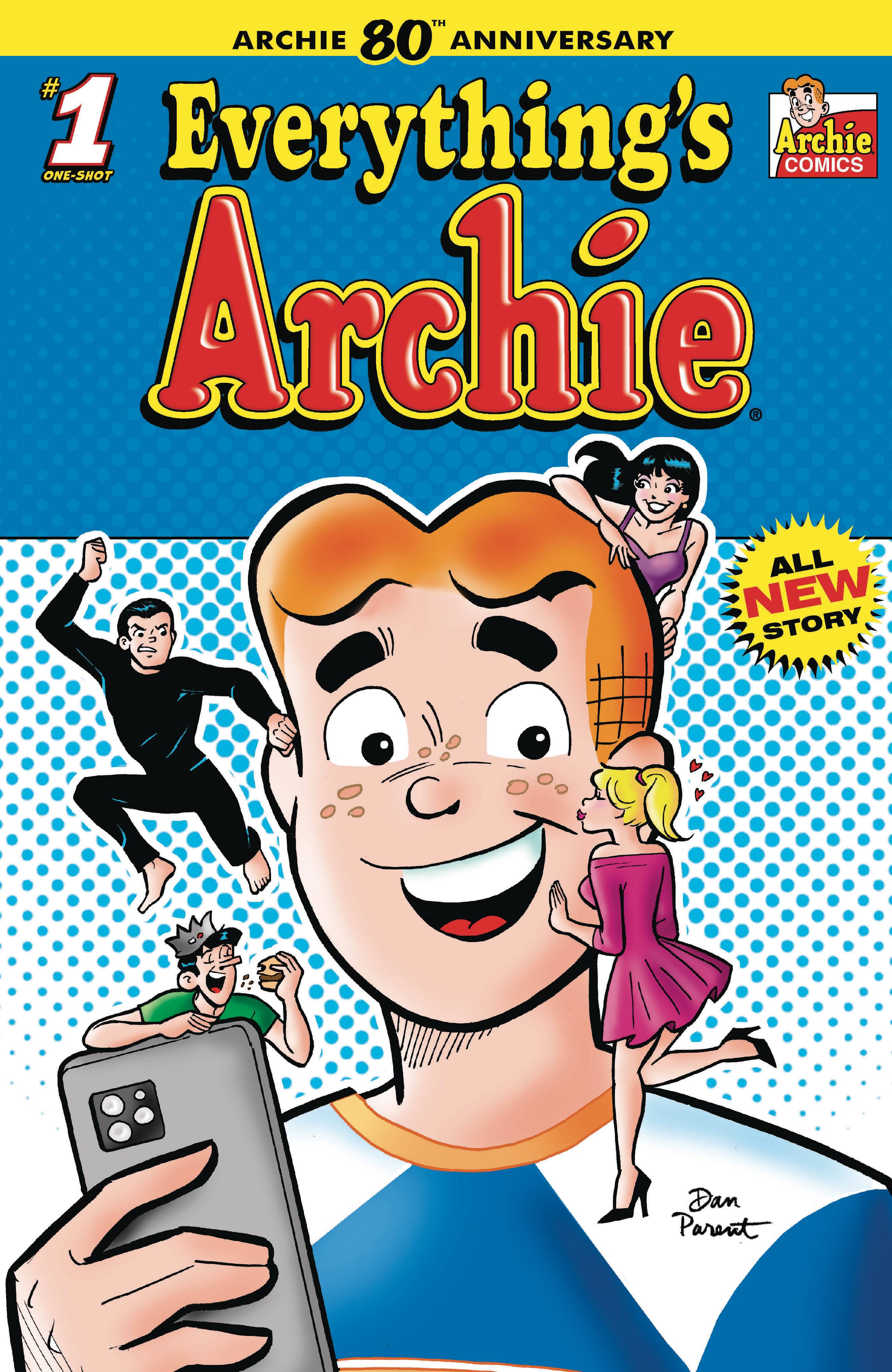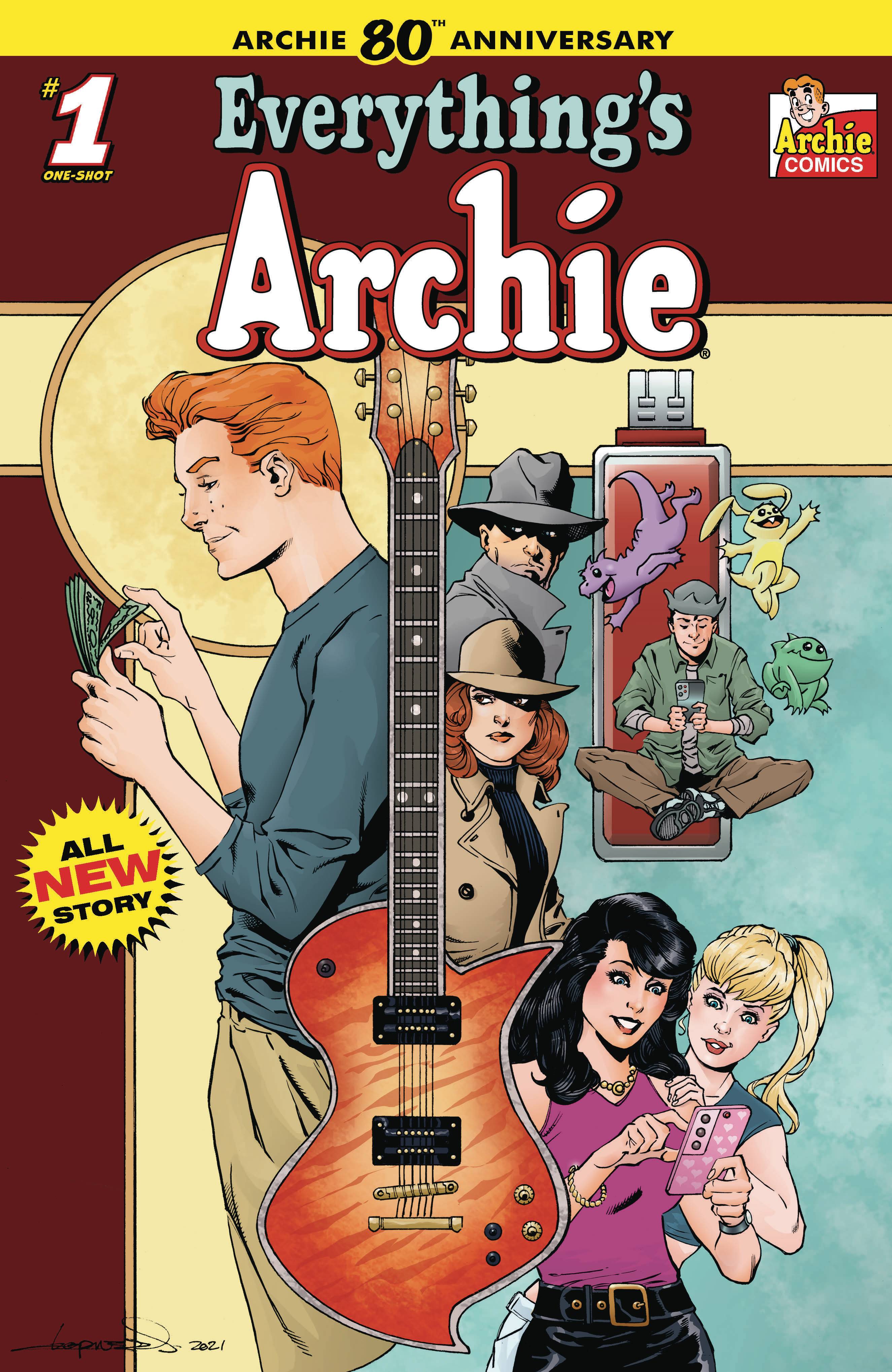 From Archie this week comes Archie 80th Anniversary: Everythings Archie #1 (one-shot). FIRST ISSUE IN AN ALL-NEW SERIES OF 80TH ANNIVERSARY ONE-SHOTS! Finally Archie declares his TRUE LOVE, and its a very expensive guitar! So Archie picks up a few extra jobs to make some cash, what could go wrong?! Spies, TV Execs, tech warfare, nothing in Riverdale will be the same! No place is safe when Everything's Archie! Cover A by Dan Parent, Cover B by Ben Caldwell, Cover C by Rian Gonzales, Cover D by Aaron Lopresti! $3.99