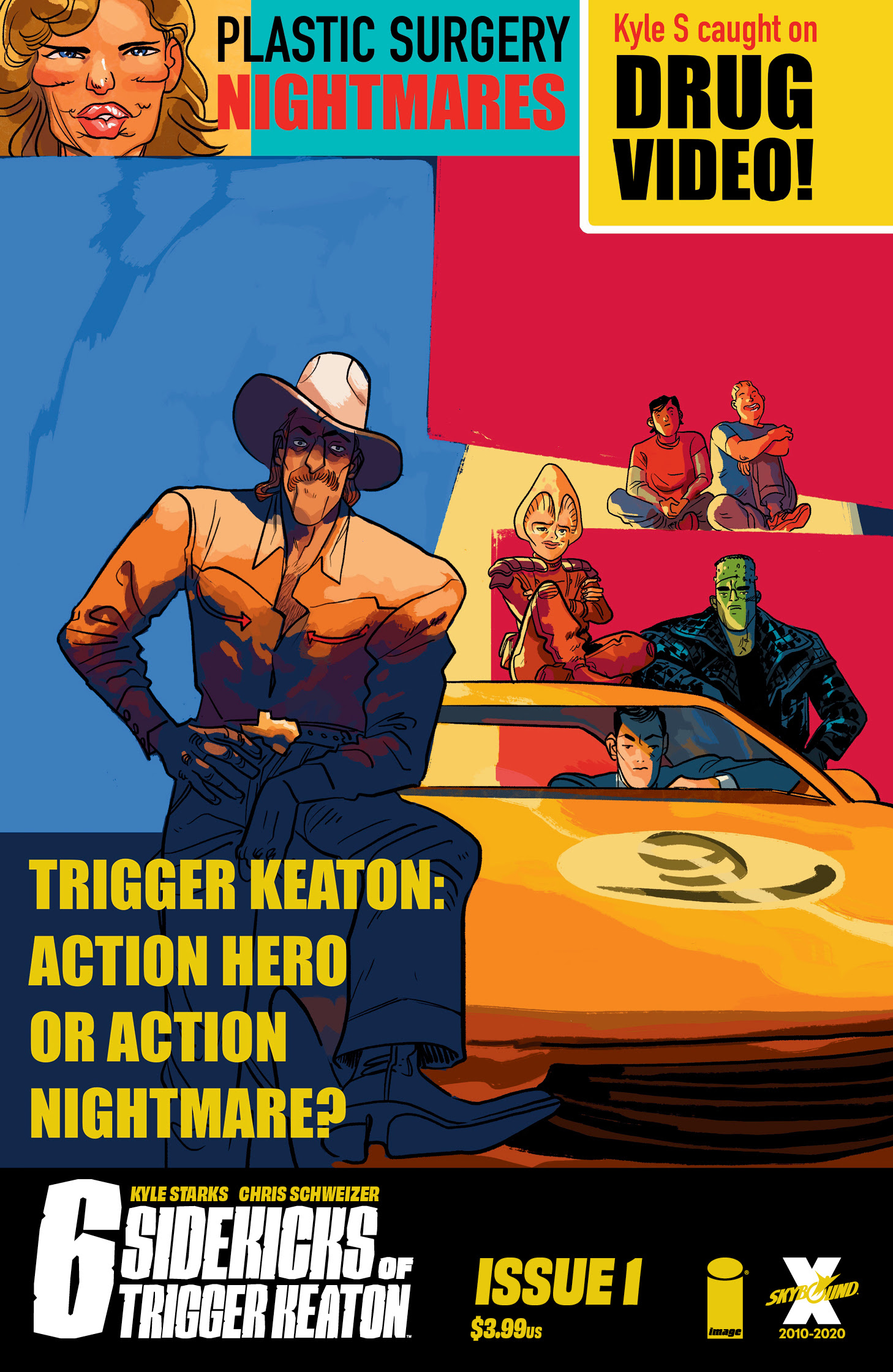 From Image this week comes The Six Sidekicks of Trigger Keaton #1! For fans of CHEW and ASSASSIN NATION comes a new action-mystery series from Eisner Award nominees CHRIS SCHWEIZER (Crogan Adventures) and KYLE STARKS (SEXCASTLE). The world's most unlikable action star has been found dead, and his previous TV sidekicks are looking to solve the mystery. But how can you catch a murderer when almost everyone hated the victim? Now these sidekicks are going to learn what it means to be the stars of the show...that is, if any of them survive the STUNTMAN WAR! Cover A by Chris Schweizer, cover B by Erica Henderson, cover C Pride month variant by Ed Luce! $3.99