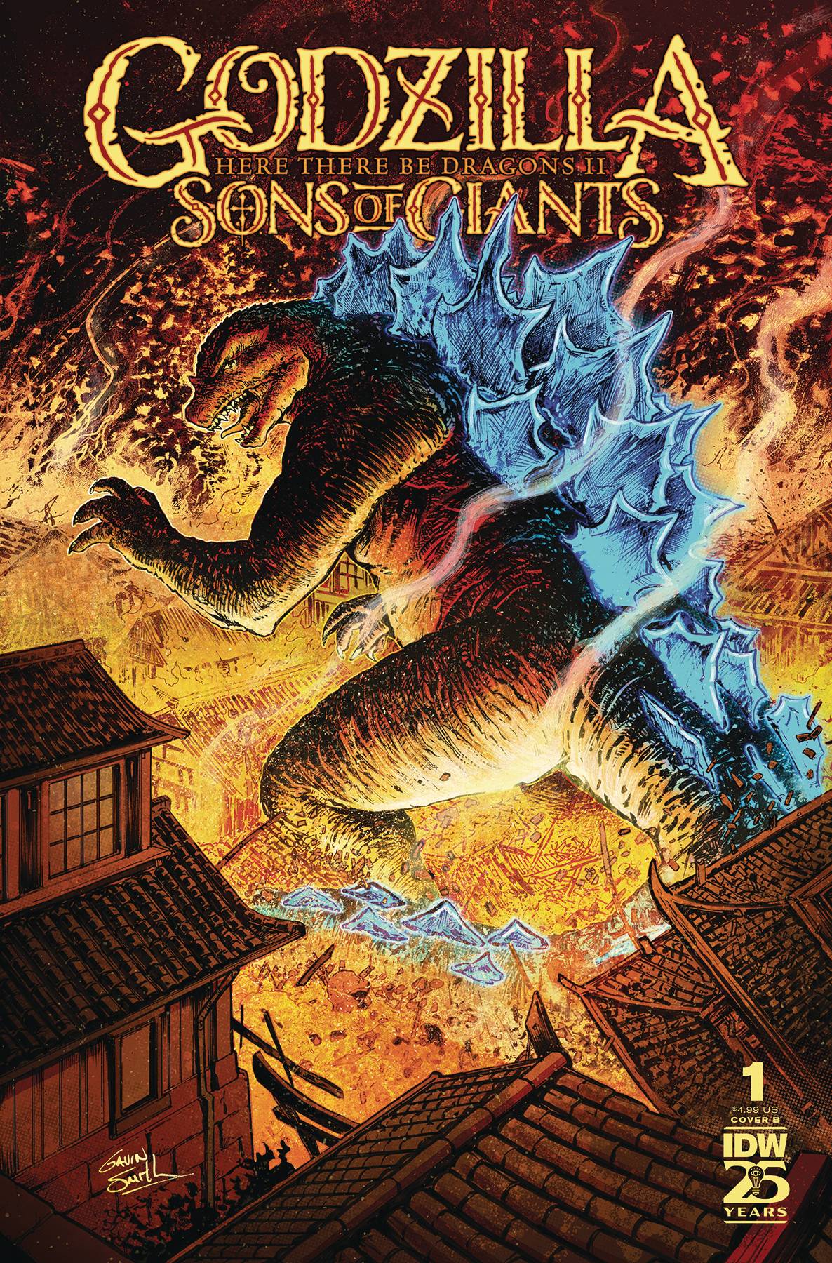 Godzilla Here There Be Dragons 2 Sons of Giants #1! A sequel to last summer's smash miniseries! Frank Tieri and Inaki Miranda reunite to explore the conspiracy that led to Sir Francis Drake hiding his treasure on Monster Island! Who are the Sons of Giants, and what is their mission? More importantly, what is their connection to Godzilla and the other monsters? This series shows us how it all came to be, how Godzilla was discovered by the leaders of the world, and how it changed history forever!