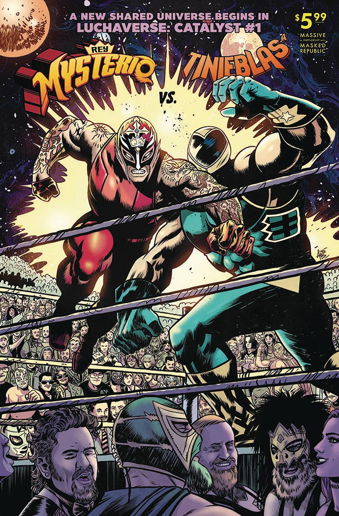 Luchaverse #1 (of 3)! It all starts here with the three-part launch of the epic new shared Luchaverse! The world's most famous luchadores battle in the ring by day, and serve humanity as monster hunters and world protectors by night. In this series, Masked Republic Comics and Massive Publishing bring back the glory and tradition of real-life lucha libre stars in comic books, setting the stage for a new era filled with epic cross-genre action in a shared universe. The first installment of the Luchaverse series is an action-packed double feature that is a perfect entry point for both long time fans of luchadores and new readers looking for genre bending adventure and universe altering mystery. First, Rey Mysterio, the world's most recognizable luchador discovers his legacy outside of the ring as the next in line to take on a great evil prophesied to return and plunge the world into darkness...Next, as heir to his own legacy as lead luchador monster hunter, Tinieblas Jr. takes on the legions of the damned and all manner of creatures that go bump in the night while trying to prevent ancient forces of the monster realm from conquering the universe!