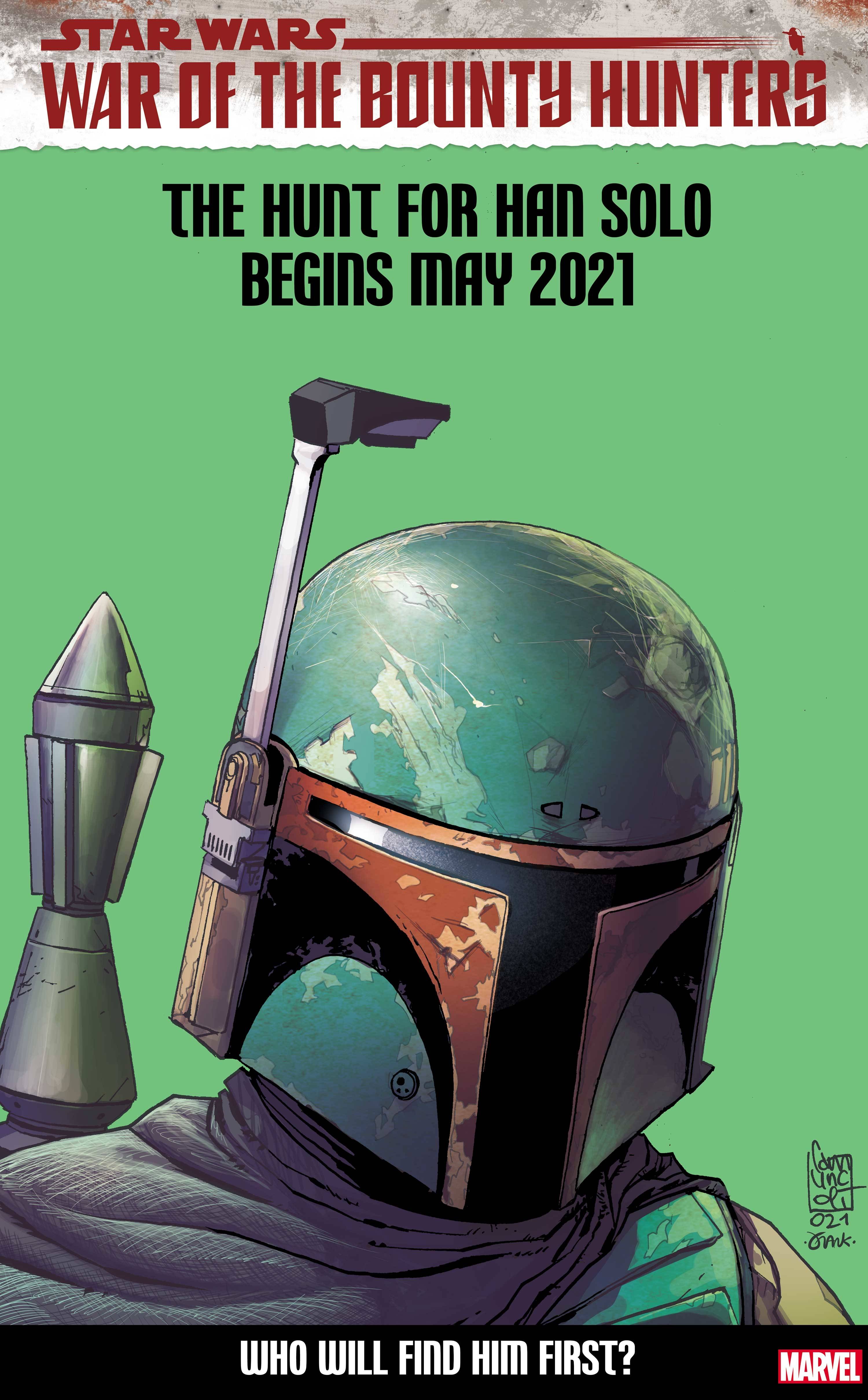 Star Wars War of the Bounty Hunters #2 (of 5)! THE BIGGEST COMC EVENT OF THE STAR WARS GALAXY CONTINUES! Notorious bounty hunter BOBA FETT has tracked his missing prize - heroic smuggler HAN SOLO, frozen in carbonite - to the remote, frozen world of JEKARA. But representatives from many of the galaxy's most powerful factions have gathered, and they all want the same thing - Solo. Things go from bad to worse, as Boba Fett realizes that he himself has become almost as valuable to the galaxy's hunters as Han Solo, and he must turn to the least trustworthy person in the galaxy for help...DOCTOR APHRA...Main cover by Steve McNiven, action figure variant by John Tyler Christopher, headshot variant by Giuseppe Camuncoli.