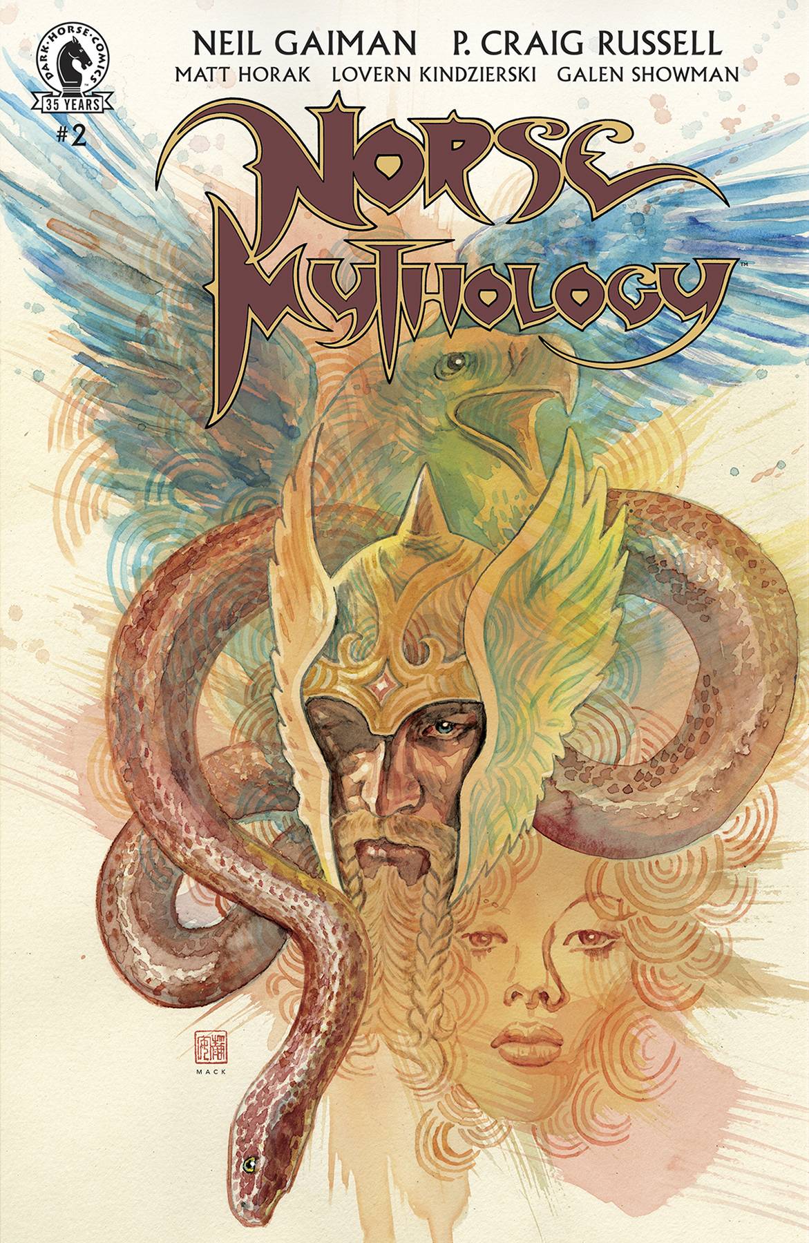 Norse Mythology 2 #2! New York Times bestselling author Neil Gaiman and Eisner Award-winning comics legend P. Craig Russell breathe new life into the ancient Norse stories by taking readers through the creation of the Nine Worlds to the epic origin and adventures of Thor, Odin, and Loki all the way to the end of life-Ragnarök. The conclusion of "The Mead of Poets," telling of the wise god Kvasir, poetry's origins, a magical mead, and Odin's devious attempts to win poetry for the gods. Main cover by P Craig Russell, variant by David Mack!