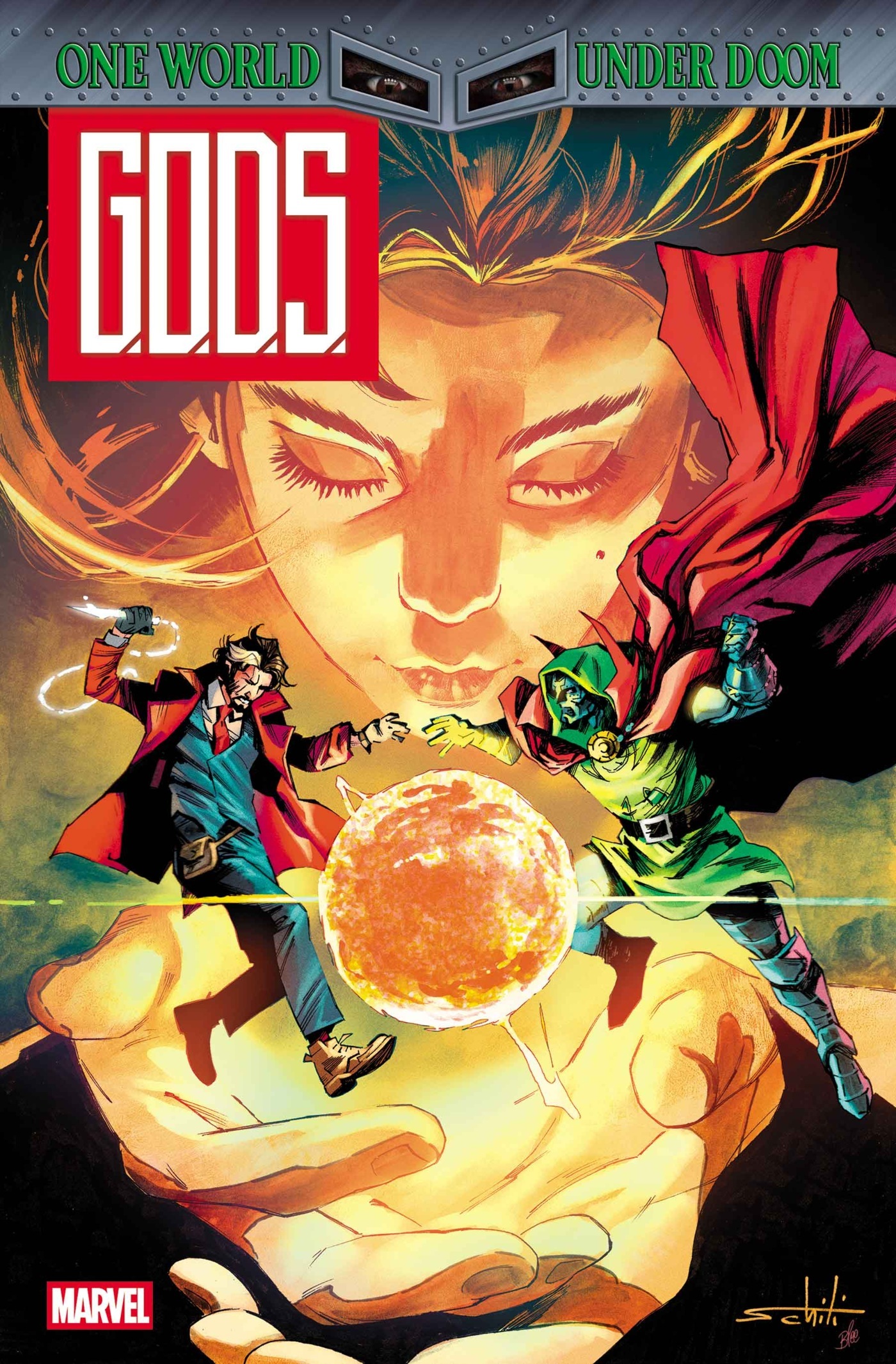 G.O.D.S. One World Under Doom #1! Using a combination of science and magic, Doctor Doom has taken over the world, which means Wyn - sole Avatar of The-Powers-That-Be (think: Magic God) - has an interest in how this happened AND how to stop it. His sworn apprentice, Mia DiMaria - a college-aged woman disillusioned with most magic, some science and definitely ALL of her job working for Wyn - is brought along, and soon finds herself at the center of a crisis that could impact Earth for generations to come. And worst of all, Doctor Victor Von Doom believes Mia has potential - especially if she were to be freed from Wyn's control. Doom offers freedom, but all gifts from Doom come with a cost...don't they? Science and magic collide in this oversized one-shot that brings the world of G.O.D.S. to the heart of the Marvel Universe! And if you don't yet know the world of the GODS, this is the book for you: It is both accessible AND apocalyptic.