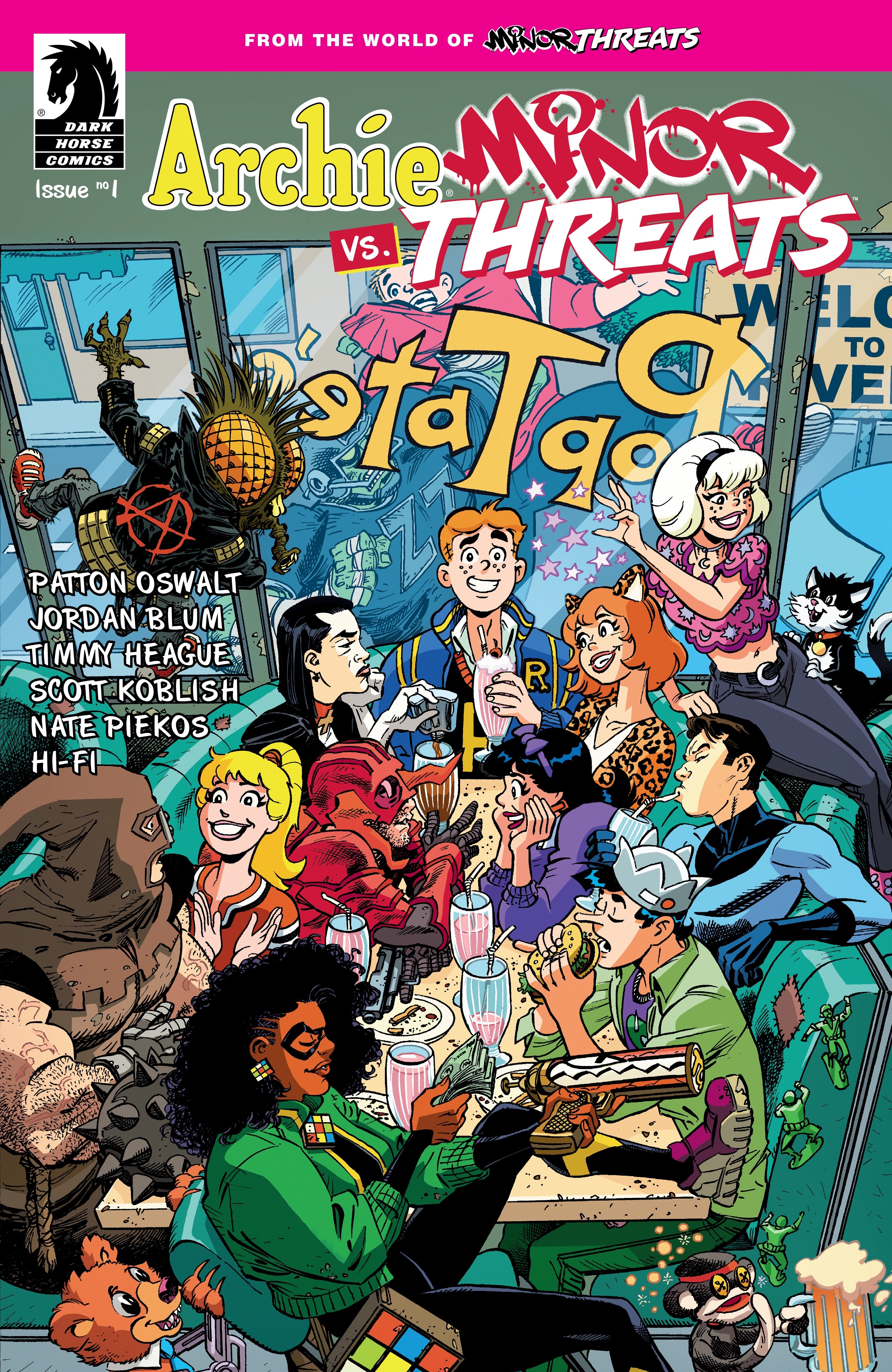 Archie Vs Minor Threats #1 (of 4)! Archie vs. Minor Threats is a collision of the bright and hopeful with the dim and dirty—with hilarious results. Sabrina the Teenage Witch is the link between the two “universes,” and let’s just say that Archie from Riverdale and Playtime from Redport find their situations topsy-turvy in the craziest, scariest way. When Sabrina the Teenage Witch hijacks a Riverdale field trip to Twilight City to recover a magical artifact, she accidentally lands Archie, Betty, Veronica and Reggie in the costumed criminal underworld led by Playtime and Scalpel. These innocent teens are mistaken for supervillain henchmen and enlisted in Playtime's current war on magic against Top Hat, a mysterious figure from Frankie's past. Meanwhile a starving Jughead and Josie and the Pussycats head to Bite Burger where they encounter Barfly's punk rocker fly $#*@eater—are we about to witness the birth of a supergroup?! The series tells a classic Archie story (Archie breaks bad to impress the girls) while unveiling a can't miss chapter in Playtime's greater journey that will have ramifications in the Minor Threats books for years. From Salem the Cat to Crab Louie this crossover features all the fan favorite characters from both universes.