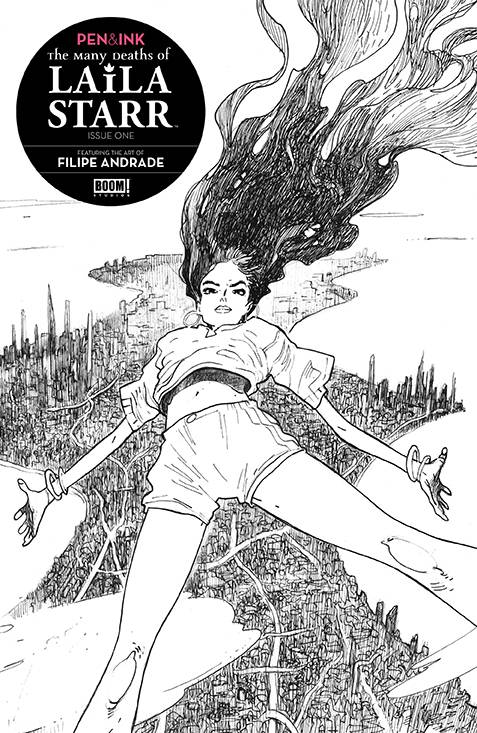 Many Deaths of Laila Starr Pen & Ink #1! BOOM! Studios is proud to present the next installment of PEN & INK: a deluxe art-focused format featuring stunning black and white interior artwork with artist commentary. Experience the first issue of the Eisner, Harvey, and Ringo Award-nominated The Many Deaths of Laila Starr in a whole new light, with exclusive notes and annotations from artist Filipe Andrade. This Pen & Ink edition will be available with a premium cardstock cover and luxurious thick wood free interior paper, alongside a gorgeous Spot UV variant cover and a blank sketch cover.