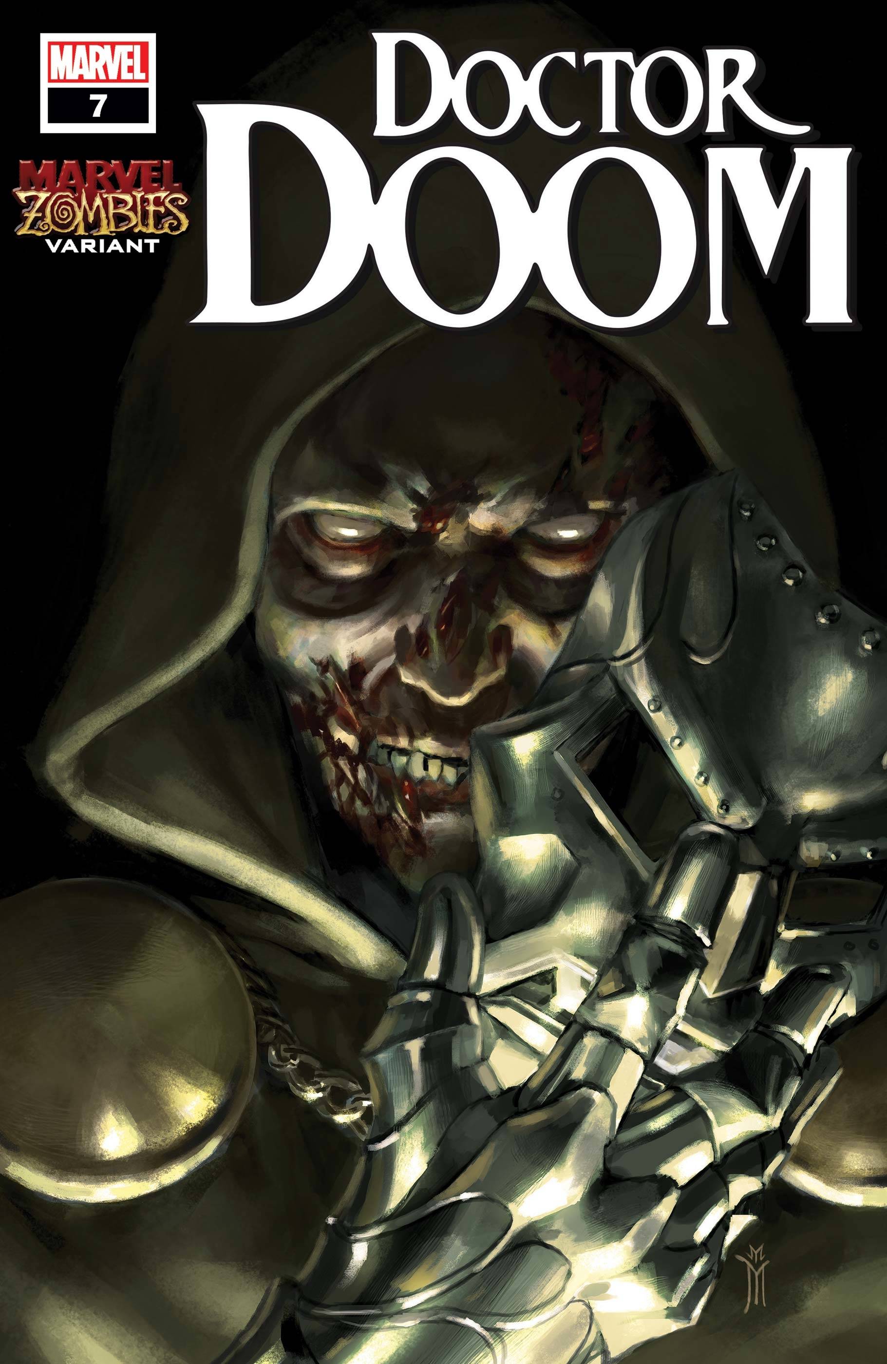 From Marvel this week comes Doctor Doom #7! Doctor Doom returns to Latveria, out for revenge on those who stole his throne away from him. With the help of his remaining allies and one of the most powerful weapons in the universe, he'll work to expose and destroy the conspirators working against him. But the black hole on the moon is growing critical, and Doom's brilliant mind may be the only one that can stop catastrophe that will wreak havoc throughout the entire solar system. Still, Doom isn't one to just offer a friendly hand... If the people of Earth want his help, he's going to make them beg for it. Main cover by Salvador Larroca, Zombies variant by Miguel Mercado!