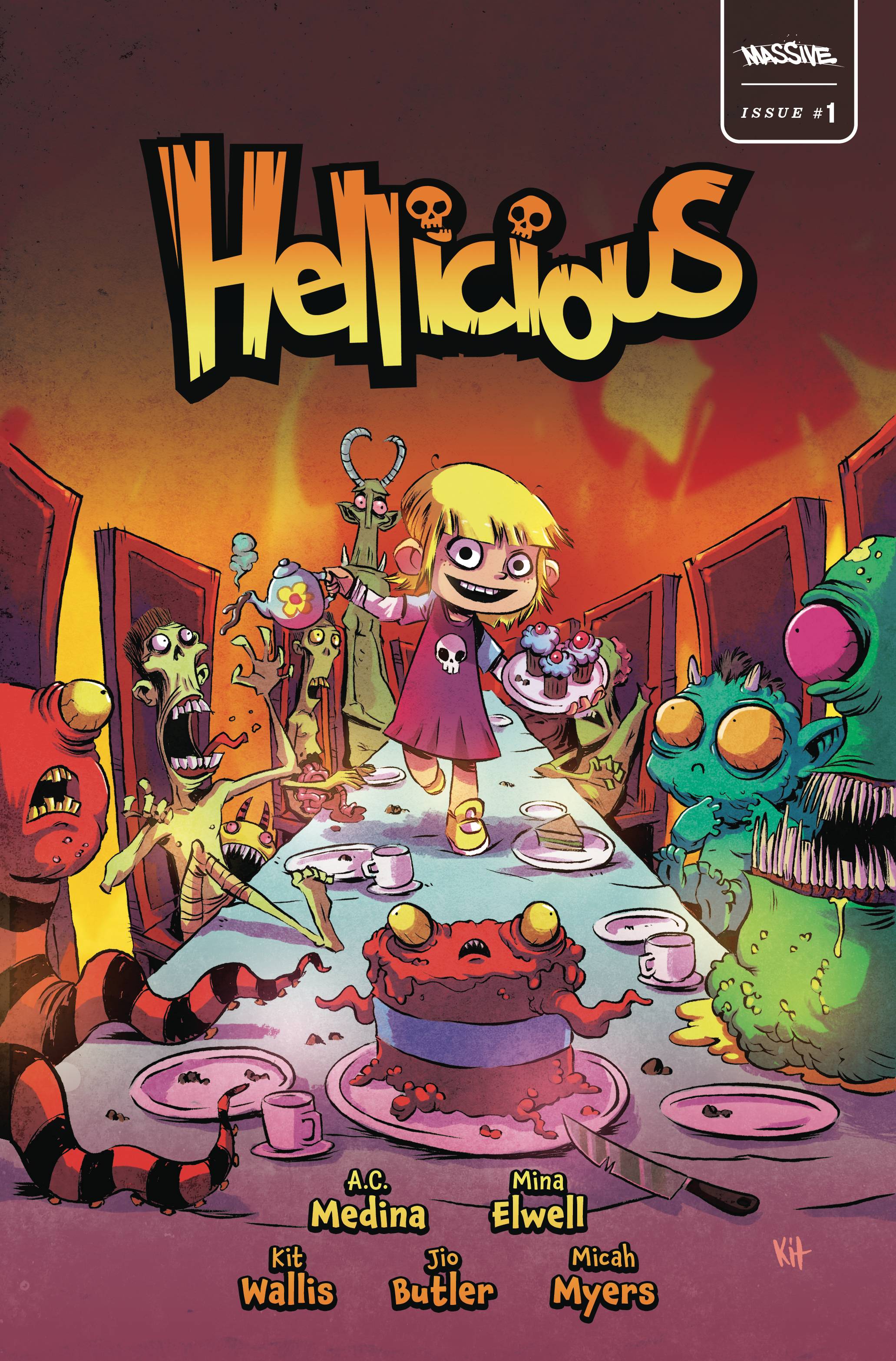 Hellicious #1! Kit Wallis, the popular artist on titles like Mr. Easta, Good Boy, and Whatnot Publishing's Quested, returns to his roots with this all-new cover for the hard to find first appearance of Hellicious! Don't miss this chance to get these brand new cover releases of the sold out debut issue of Hellicious, soon to be an animated series starring Anthony Kiedis of the Red Hot Chili Peppers! Meet Cherry, the Devil's prankster granddaughter and the cutest grim reaper in Hell. She loves everything about her home - its burning landscapes, its horrific inhabitants, and especially her demonic family - but she's lonely. She might look like a little girl, but she's much too powerful for the imps and the damned inhabitants of the underworld. There's only one soul who Cherry thinks might be a good playmate - Satan-worshipping death metal frontman Briggy Bundy. The bad news is, he isn't dead...Yet. But Cherry won't let a little thing like that keep them apart... and all Hell breaks loose when Cherry defies the order of the afterlife to finally have the best friend she's always wanted.