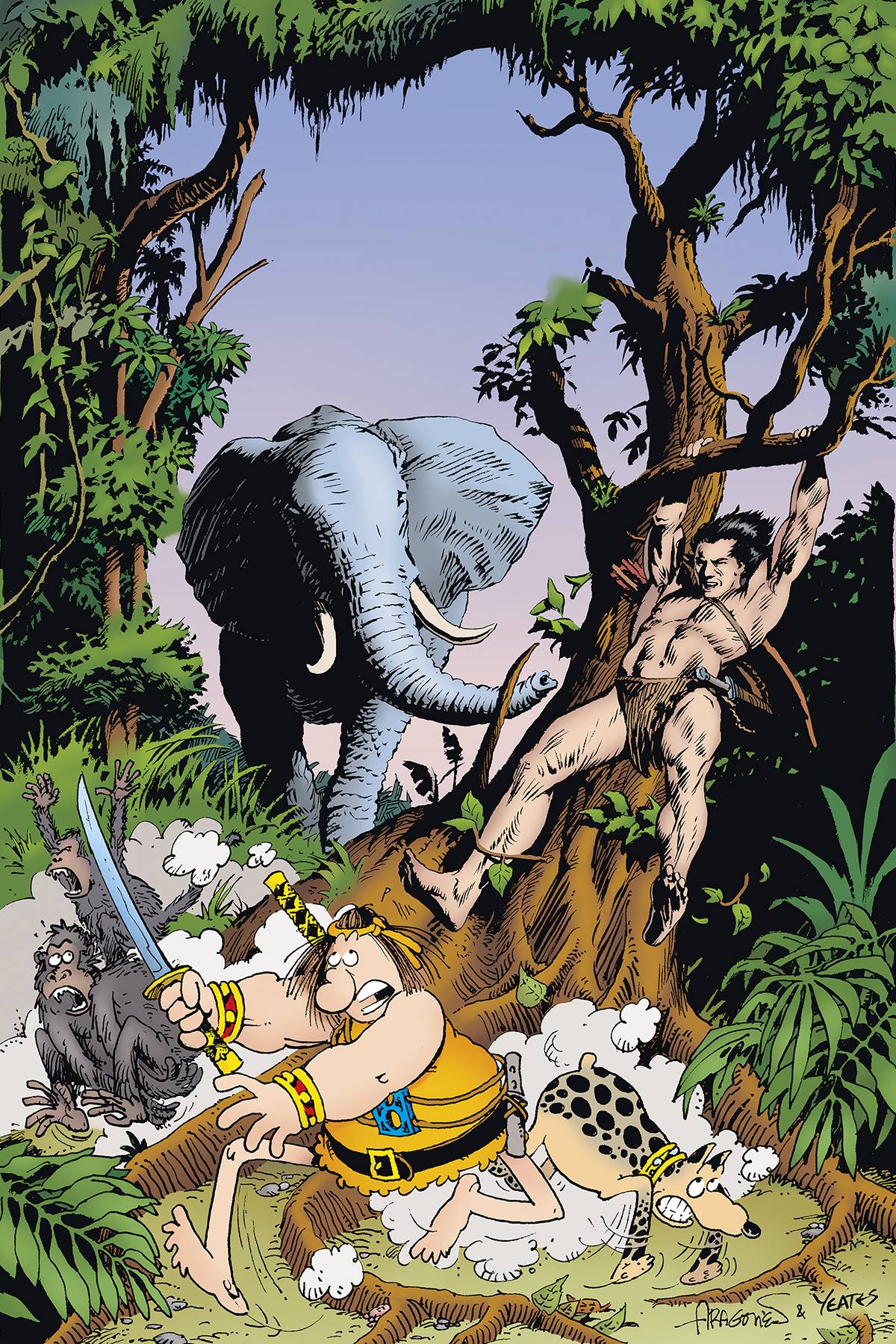 Groo Meets Tarzan #2 (of 4). A bumbling barbarian encounters the cunning lord of the jungle, but will Groo wind up destroying the jungle itself or teaming up with Tarzan to fight slavers? With cartoonist Sergio lost and running from hungry lions in Chula Vista's Jungle Safari Land and script writer Mark doing panels all day at Comic-Con, how will this comic get finished in time? Legendary Tarzan artist Thomas Yeates swings in to help! Plus-the Rufferto backup strips continue!