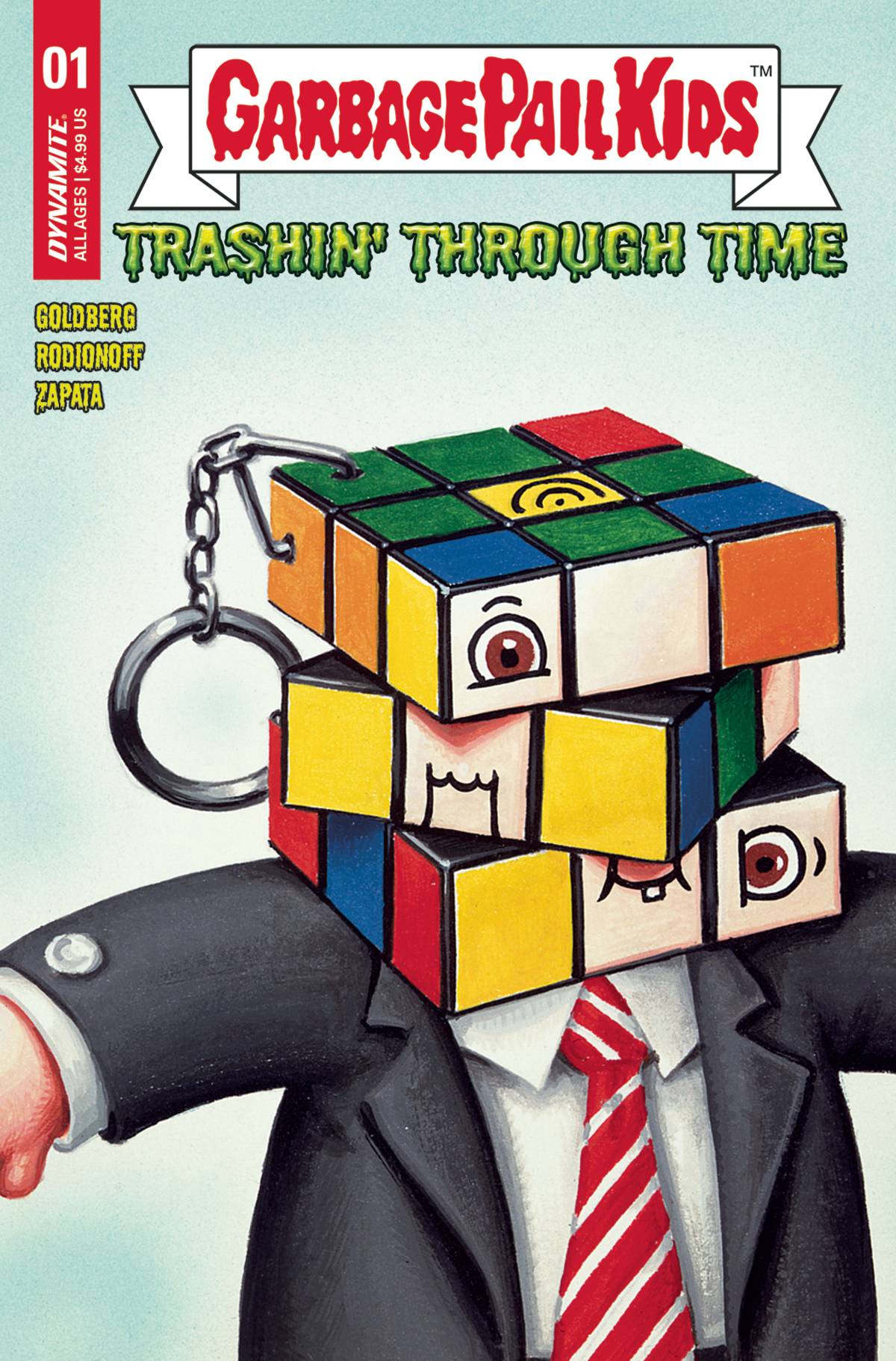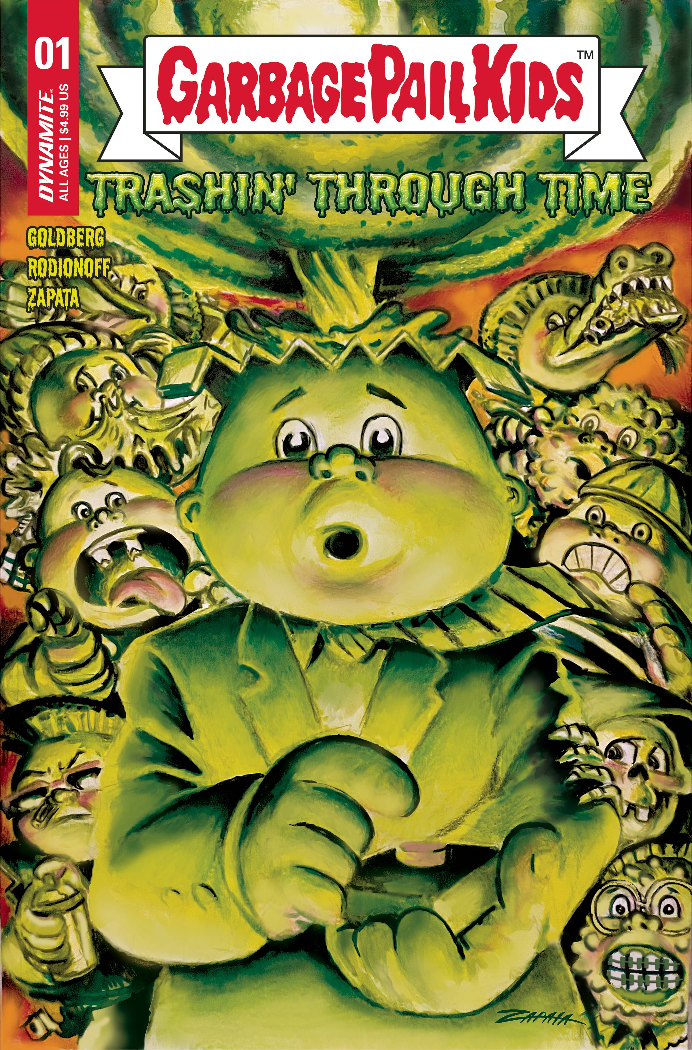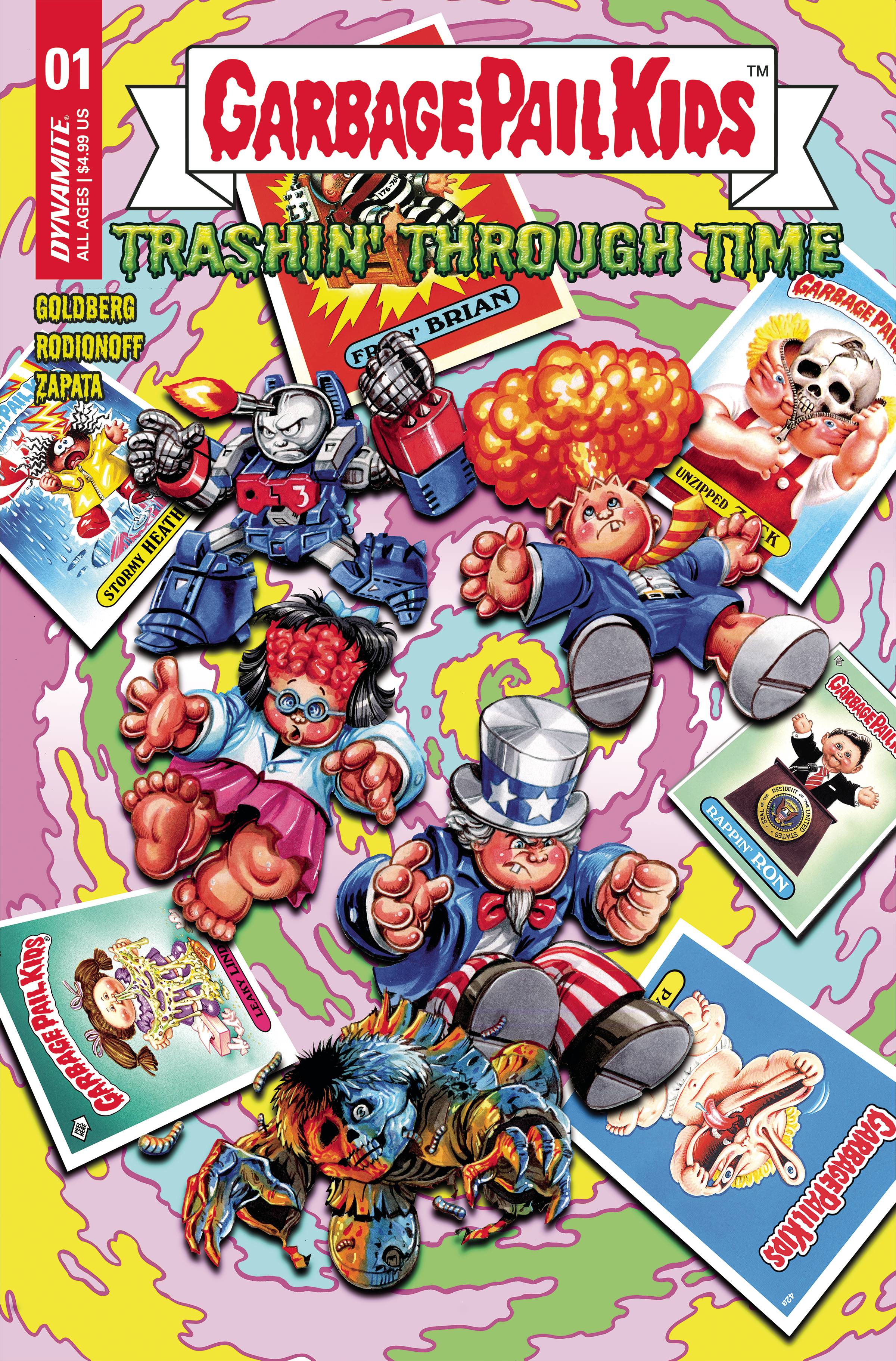 Garbage Pail Kids Trashin Through Time #1! "The unhinged trio of ADAM F. GOLDBERG, HANS RODIONOFF, and JEFF ZAPATA have rejoined forces with Dynamite Entertainment to continue their saga of the outrageous origins of the Garbage Pail Kids as they go Trashin' Through Time! Jumping from the days of World War II at the end of GPK: Origins, our heroes find themselves transported to the 1980s - where Garbage Pail Kids rule the world! That's right, the Garbage Pail Kids are now the dominant species on Earth, and normal humans have been subjugated and forced to live as outcasts from society. It's the Planet of the Garbage Pail Kids - and we just live on it!