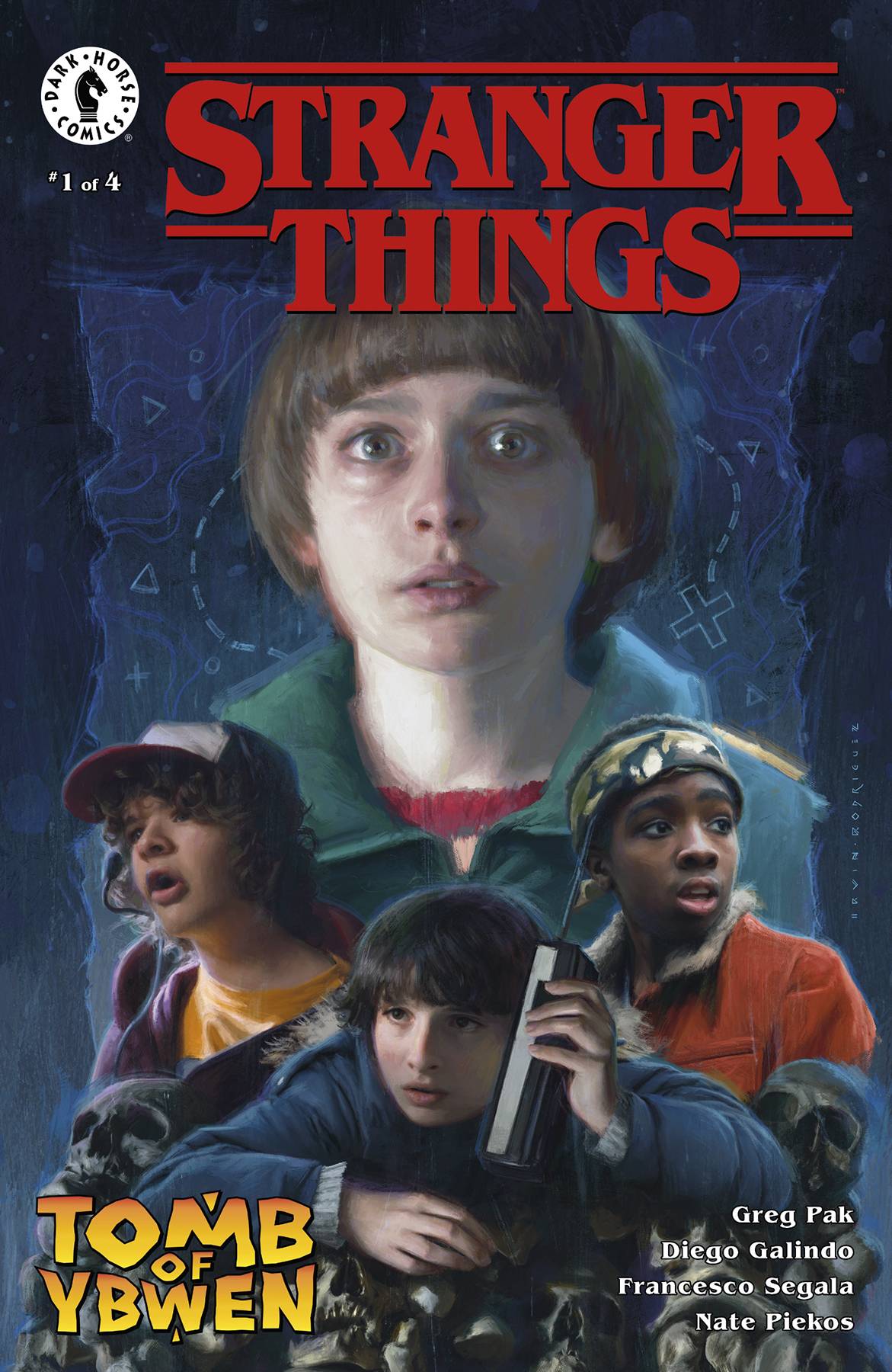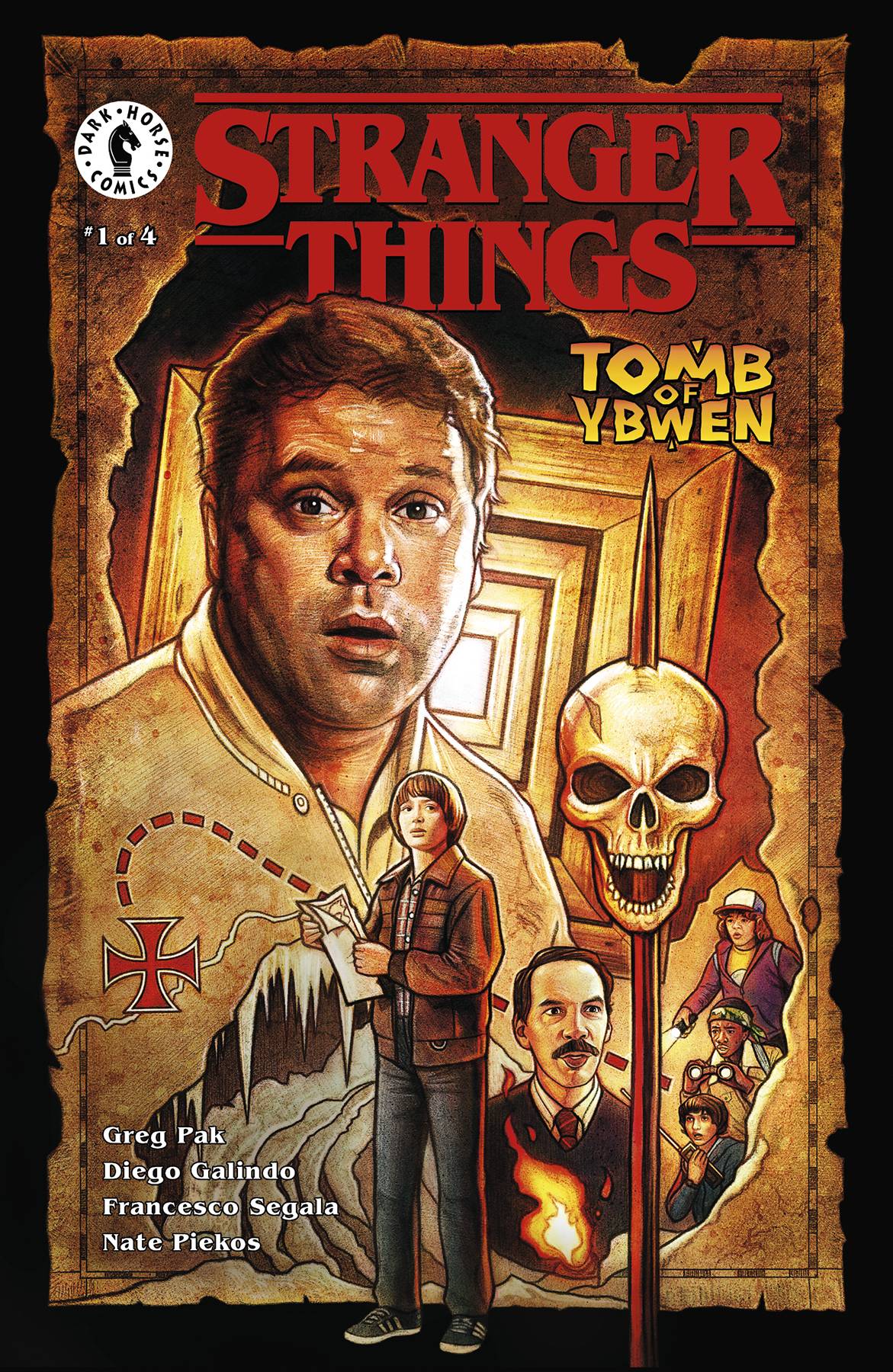 Next from Dark Horse is Stranger Things: Tomb of Ybwen #1 (of 4)! It's January 1985 the Hawkins crew survived their battle with the mind flayer, but Will and Joyce are still reeling from the recent death of Bob Newby. Will's friends have been too busy with their girlfriends to notice how much he is struggling. After he and Mr. Clarke discover a mysterious map Bob left in a box of old nerdy memorabilia, Will rallies the crew to investigate. Is there a secret hidden in the hills of Hawkins? Cover A by Marc Aspinall, Cover B by Kyle Lambert, Cover C by Diego Galindo, Cover D by Irvin Rodriguez!