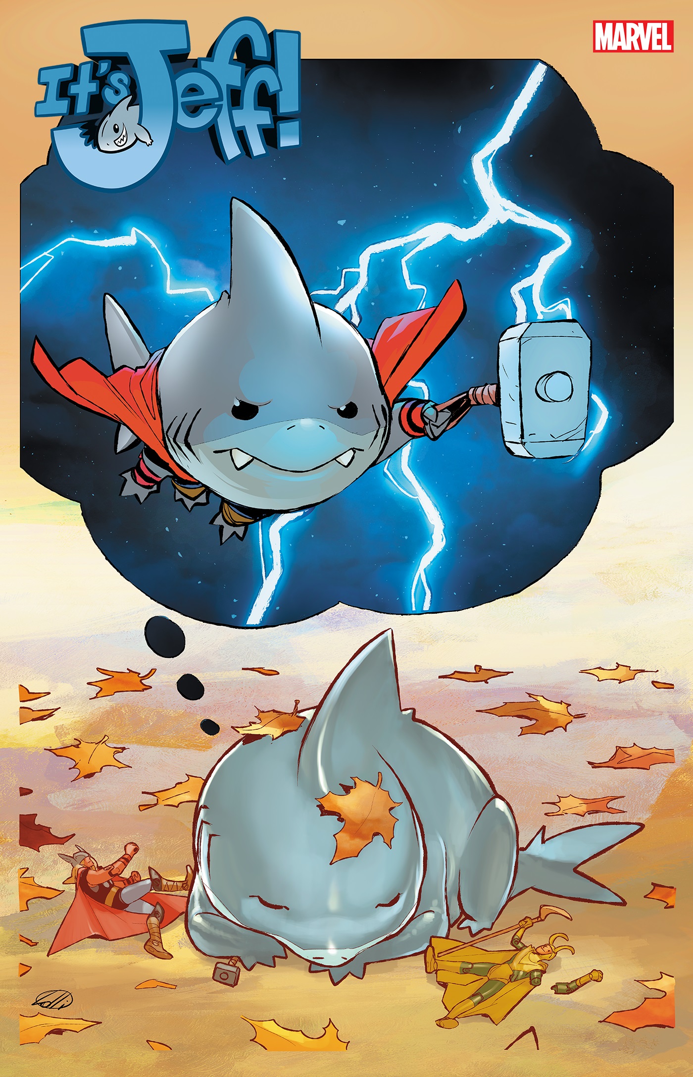 It’s Jeff the Jeff Verse #1 (one-shot)! THE DANGEROUSLY ADORABLE JEFF THE LAND SHARK RETURNS! Jeff the Land Shark embarks on another series of madcap adventures with guest spots from some of your favorite heroes! Whether he's orchestrating a pet shop takeover, or solving a high-stakes mystery like "what's the best street-food snack" (the answer will SHOCK you, True Believer), Jeff is flipping his fantastic fins all over the Marvel Universe! Stealing hearts and cookies with equal impunity! Collecting issues #13-24 of the hit Infinity Comics series from the Marvel Unlimited app, this one-shot features a brand-new cover and never-before-seen story from beloved creators Kelly Thompson and Gurihiru! Kids to Adults!