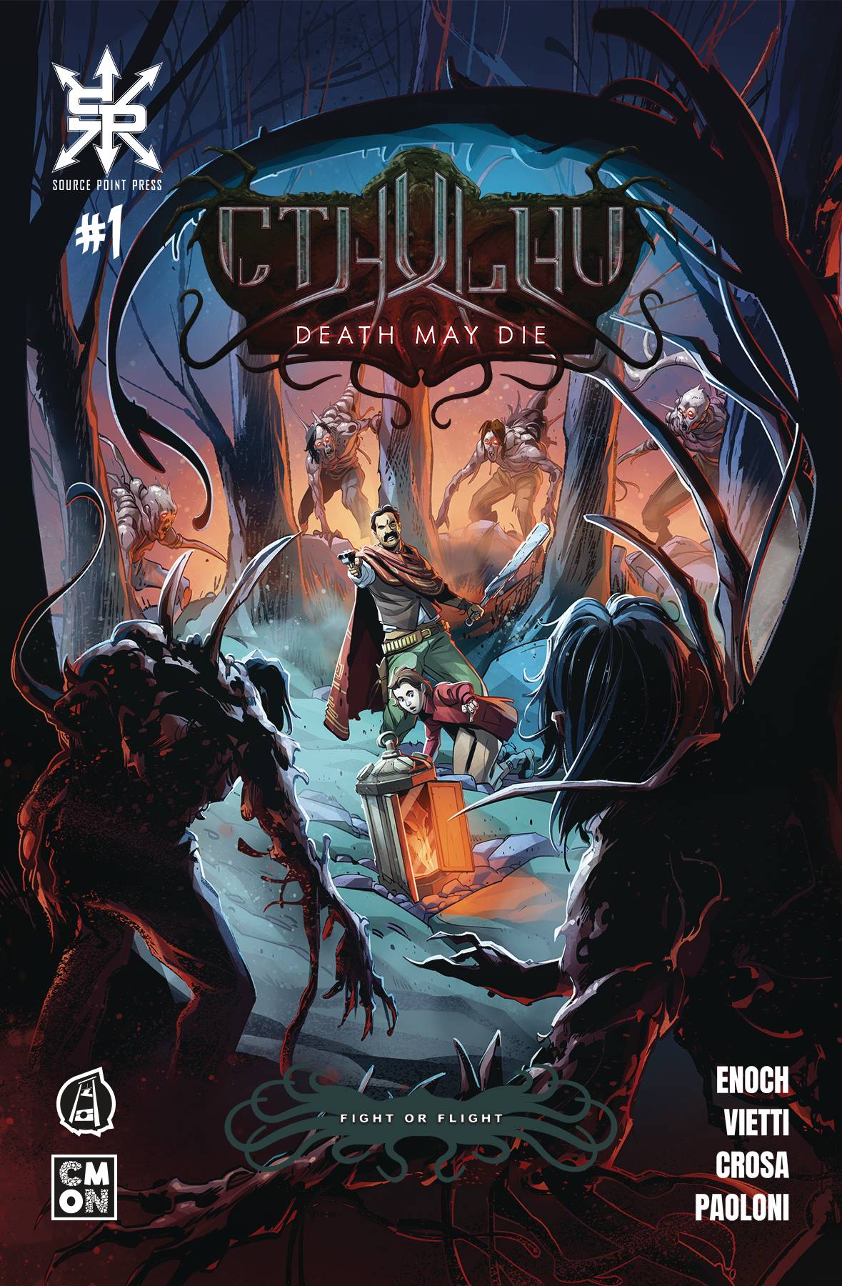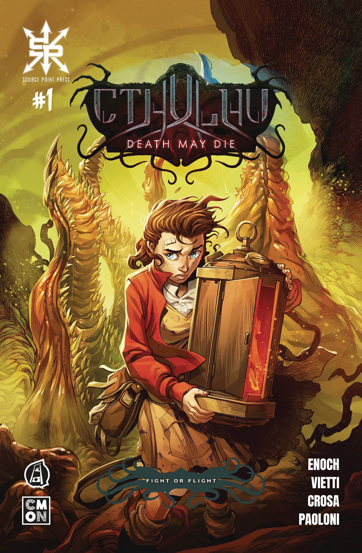 Cthuhlu Death May Die #1 (of 4)! The whole of Miskatonic County lies under a cloak of horror. Leaden clouds darken the sun, and horrific creatures lurk in the countryside. The Last Hope Orphanage finds itself under seige, and the only possible salvation resides on the page of a book of spells, itself cursed and profane. An unlikely assembly of heroes will undertake insane odds in their quest for the book: Lysa, aided by a demon's head kept in a lantern; Jack, with his amazingly unstoppable truck; Rocco, haunted by a berserker madness from fighting in the trenches; Annabelle, the young voodoo queen of New Orleans with her dark powers. Time is running out. The way is shrouded. "They" are everywhere. In the deep, the nightmare waits dreaming.