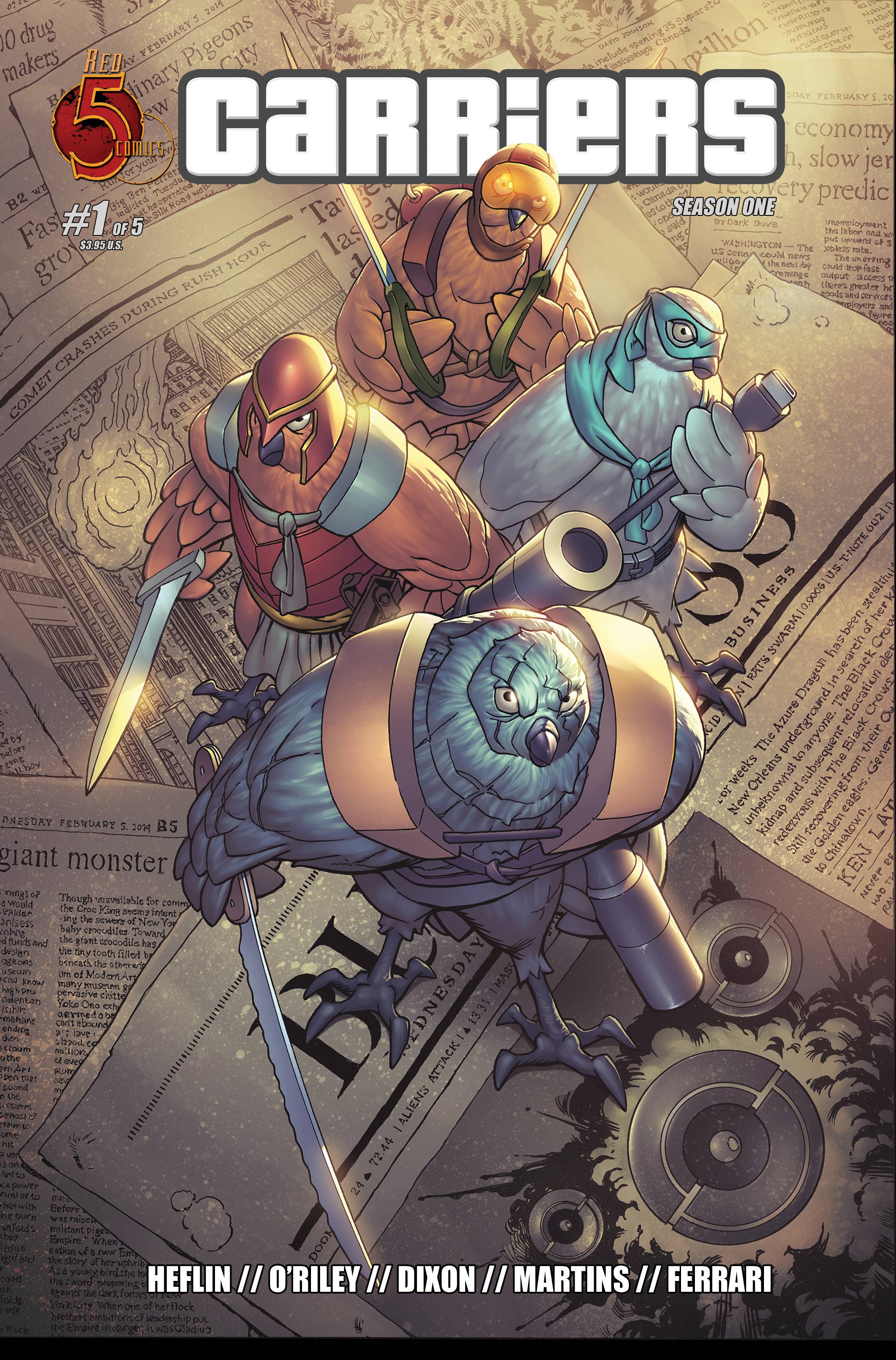 From Red 5 Comics this week comes Carriers #1! Fable, Gladius, Cherrybomb, Dark Dove: no one has heard of these brave heroes ... yet ... but they are the only thing standing between the citizens of New York and the unseen terrors that lurk all around them. A band of weaponized carrier pigeons, they soar the night sky looking for new threats and find their largest one yet when the Croc King comes climbing up out of the New York sewer. Cover A by Elias martin, Cover B by Jeff Johnson. $3.99