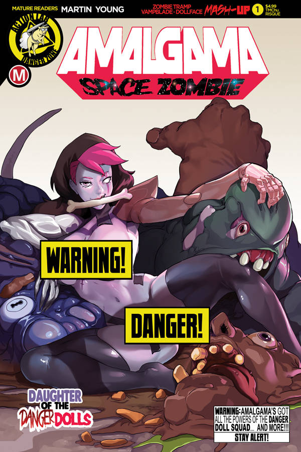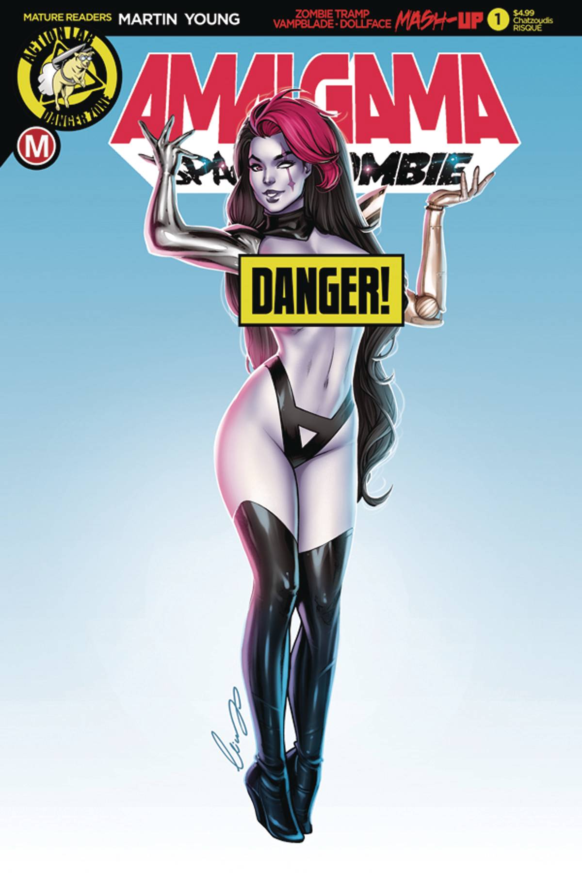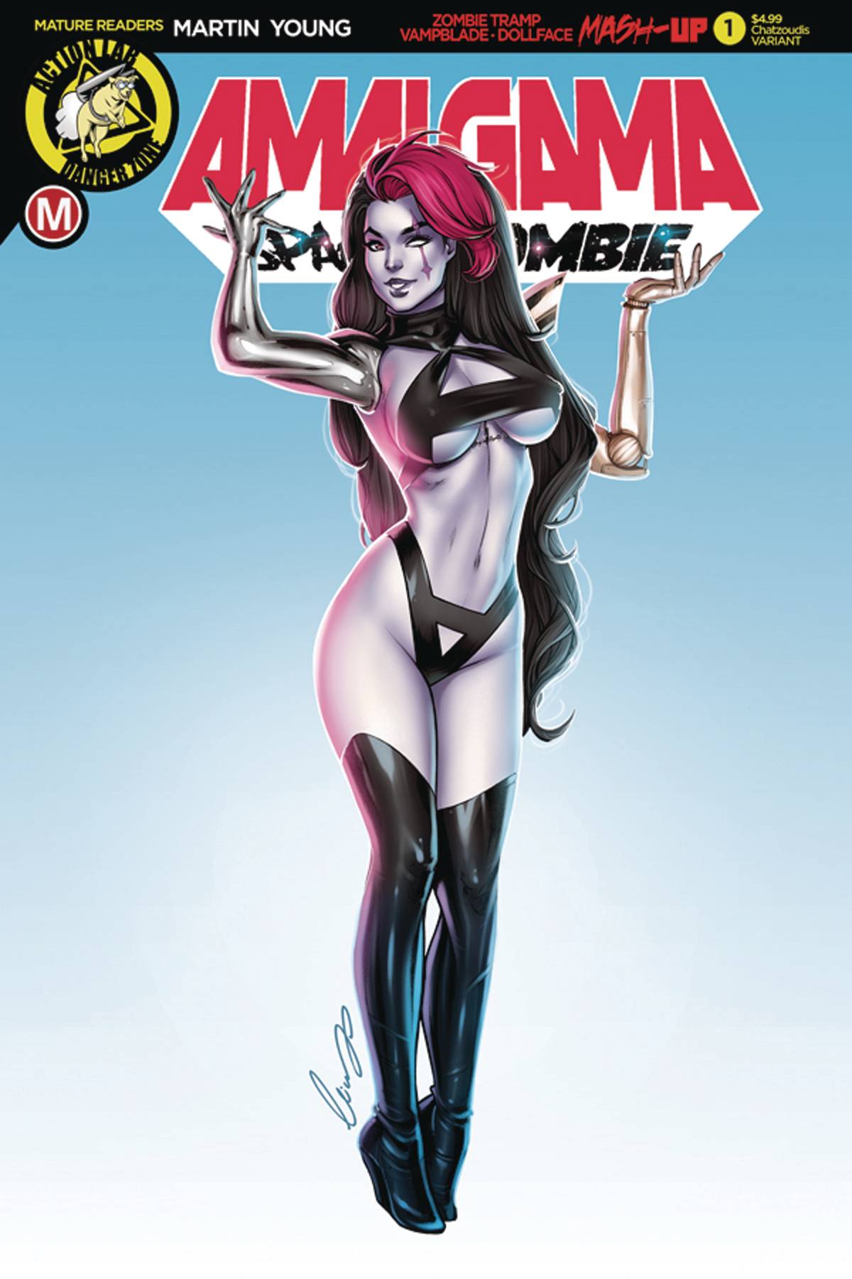 From Action Lab, and in stores on 10/2 is Amalgama Space Zombie #1! Now in her own series, the fan favorite Zombie Tramp/Vampblade/DollFace mash-up (with the powers of all three iconic characters) returns! Rocketed into space by the Danger Doll Squad, Amalgama: Space Zombie plots a course for explosive sci-fi grindhouse action! Features 4 regular and risqué variants, including cover 1 of 3 from the Elias Chatzoudis Amalgama variant set!