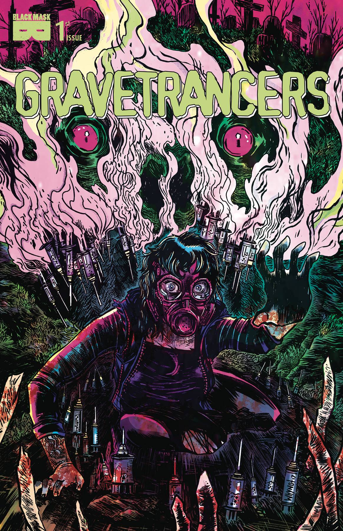 From Black Mask this week, a new series called Gravetrancers hits the racks. Written by M.L. Miller with art by James Whynot, Gravetrancers delivers a grisly grindhouse tale of taboo and terror. On a journey to track down the grave of their estranged father, Maribel and Anthony find their way to the Malort Cemetery, a strange, seemingly abandoned field of mostly unmarked tombs. There they encounter an eccentric clan of grave-robbers who've devised a highly-addictive drug made from human remains--and the fresher the corpse, the stronger the dose. What started out as an attempt to reconnect with the past becomes a descent into a psychedelic, neon-colored nightmare, will Maribel and Anthony find their way through the hallucinogens or will they become the next hit?