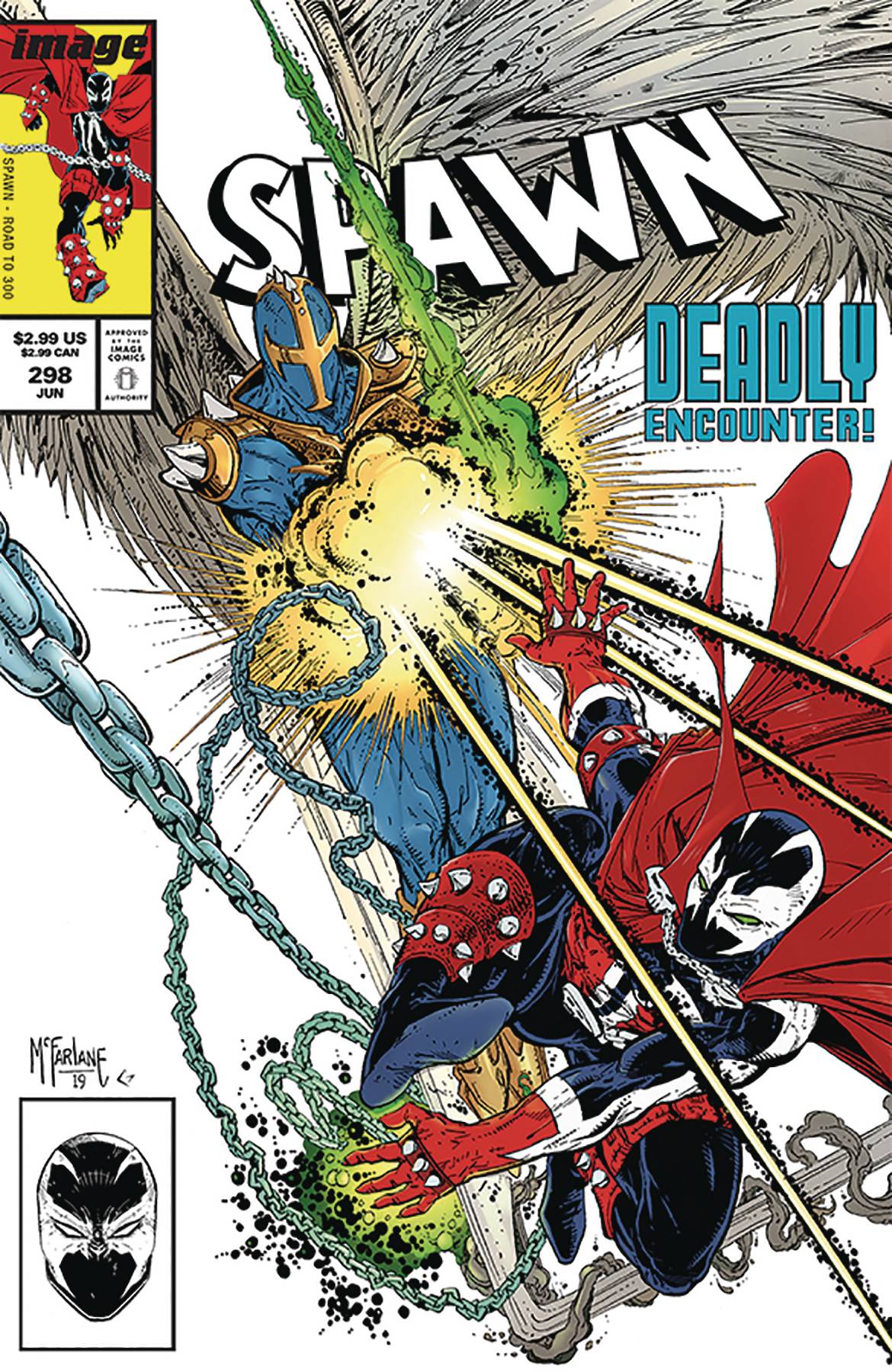From Image this week, Spawn #298 hits the stands! "WAR TO 300," Part One-TWO ISSUES 'TIL SPAWN #300! Spawn vs. the full might of Heaven's newest Godsend-ROUND 1! TODD McFARLANE and JASON SHAWN ALEXANDER up the ante in this lead-up to SPAWN's record-setting 300th issue, featuring TODD McFARLANE's special parody recreation of one of his own classic comic book covers!