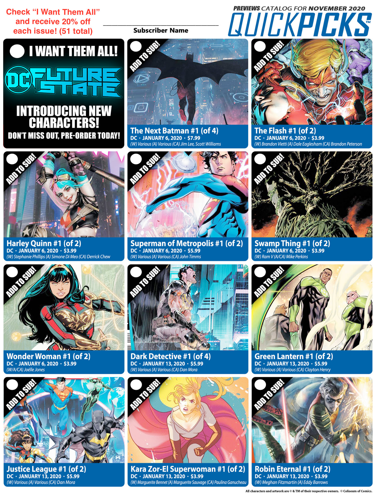 As an added bonus, if you choose that you would like ALL of the Future State titles we are offering a 20% discount on all 51 issues of the main covers OR all 51 issues of the variant covers!