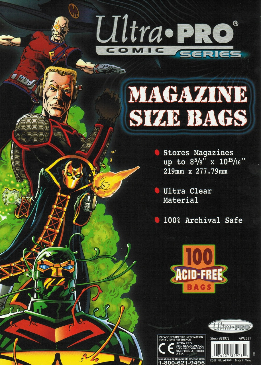 Ultra clear, archival-safe comic bags designed to fit magazines, photos and documents up to 8-3/4" X 11" in dimension. 100 per pack, acid-free and no PVC.